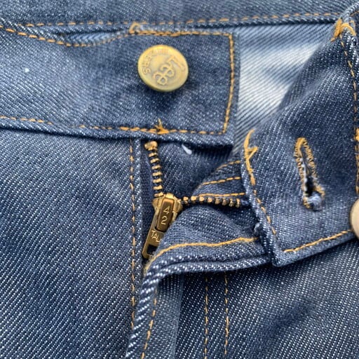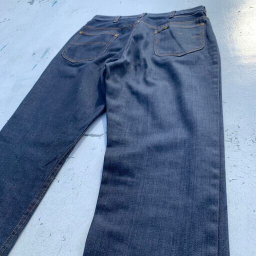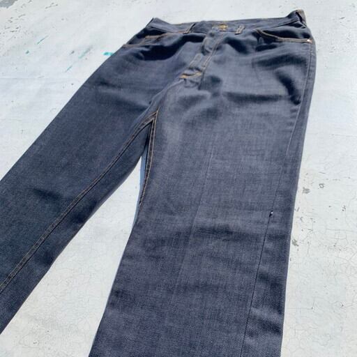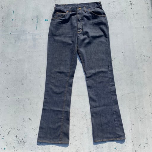 70年代頃のLeeブーツカットデニムです。ライトオンスのデニムを使用しており、恐らく201のラインかと思われます。VAT DYEのような少しマットな色合いです。フロントは42TALONを使用。色落ちはほとんど無いですが、バックポケット等ののステッチ飛びや裾に若干のダメージがございます。レングスはシングルでオリジナルです。春先に使いやすいライトオンスデニムですので、お勧めです。