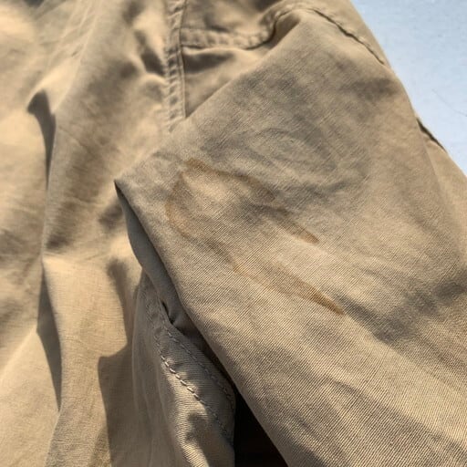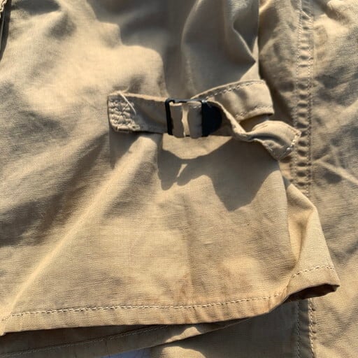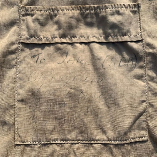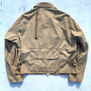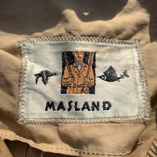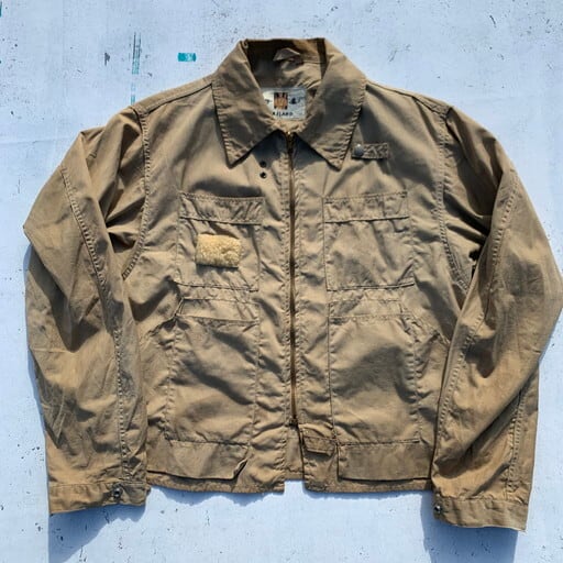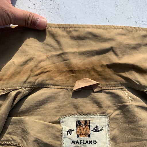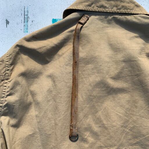 50年代頃のMASLAND CREEK COATです。こちらはコリンボによる復刻では無くオリジナルのフィッシングジャケットです。有名なFAST WATER JACKET等に使用されていたMOUNTAIN BRAIR CLOTHと違い、薄手なSPORTSMAN’S TWILLと呼ばれる生地が使用されているようです。四角いポケットやロッドを固定する為のタブ等フィッシングジャケット特有のギミックが非常に興味深いアイテムです。背面にはパイピング処理をされていないマップポケットも付きます。背面にはカスタムなのか、リングの付いたテープが縫い付けられております。左胸には手書きでJAKEという人物へメッセージが入っています。全体に使用感、シミや汚れもございますが、サイズ感も良く非常に希少な1着です。