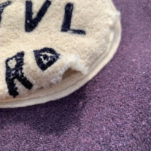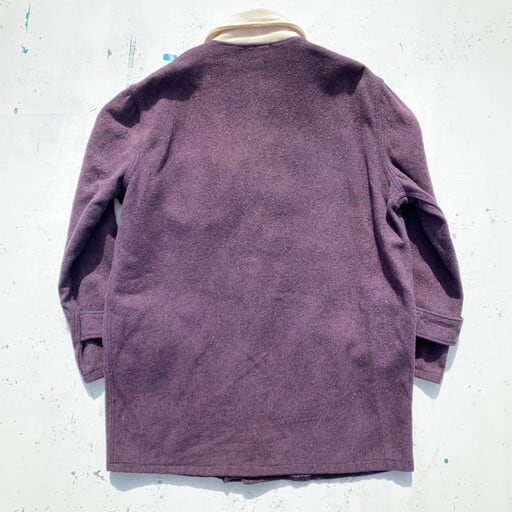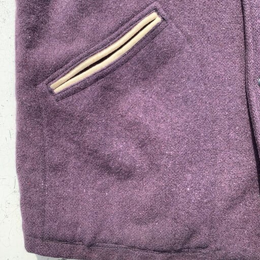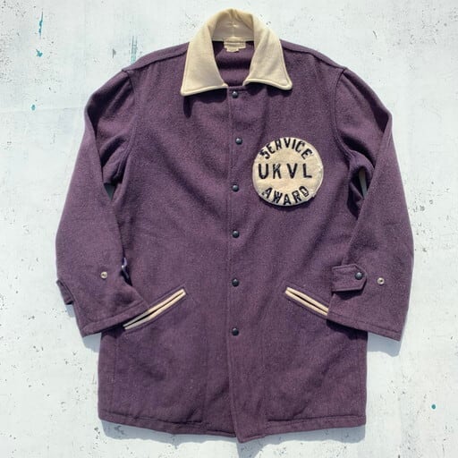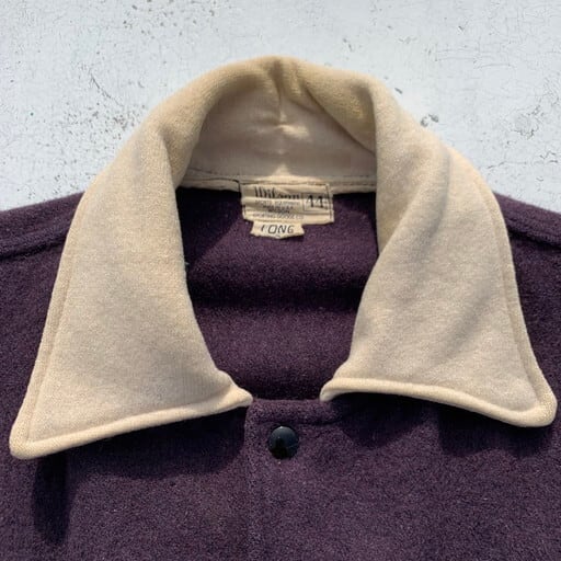 40年代から50年代頃のWilsonアワードジャケットです。淡いパープルとホワイトの珍しい2トーンカラーで、通常のロンスタとは少し違う袖回りのストラップが特徴的な1着です。サガラワッペンは若干ダメージが見られます。着丈も長く身幅も大きいので、オーバーコート(ベンチコート?)のような役割で使用されていたのかもしれません。襟元に変色が見られますが、虫食いなども見られず状態は良好です。大き目なサイズですがくたっとした柔らかいウール素材ですので、カバーオール感覚で合わせてみてはいかがでしょうか。