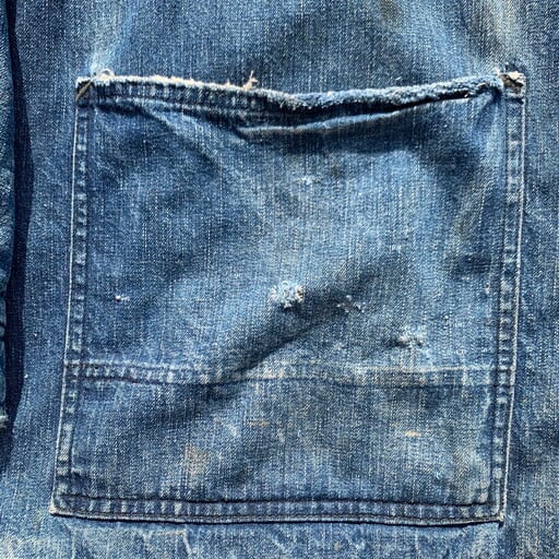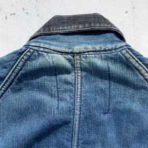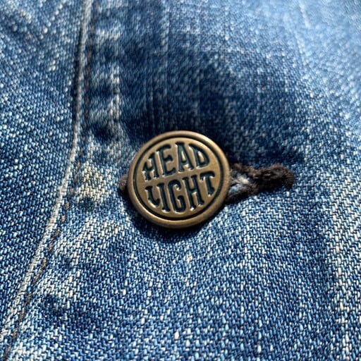 40年代から50年代頃のHEAD LIGHTデニムカバーオールです。1920年代にラーンドカーター社から生まれた言わずもがな有名なヴィンテージラヴァーにはおなじみのブランドHEAD LIGHT。近年その人気の高さ故に実名復刻もされています。こちらは裏地にブランケットライナーの付くラグランスリーブ仕様の1着。ボタンは社名が刻印されたシンプルなデザインですが、フロントボタンと胸のスナップボタンで刻印の溝の色が違うのがとても興味深いディティールです。ライニングや袖、袖口などにダメージがあり、左ハンドポケット内側にも敗れが見られます。しかしながらヴィンテージ好きには溜まらない経年ならではの使い込まれた色落ちが最高にかっこいい1着です。170cm70kgでほど良くゆったりとしていて、40~42位のサイズと思われます。HEAD LIGHTのオリジナルは今後さらに入手が困難になると思われますので、お探しだった方、この機会に是非いかがでしょうか。