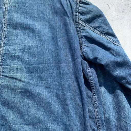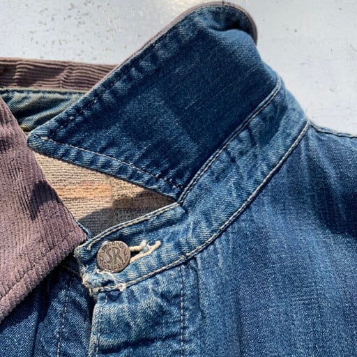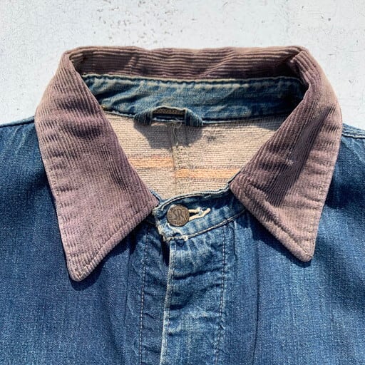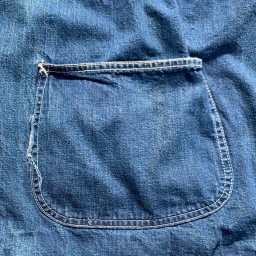 40年代頃のSEARSが展開していたワークブランドSTRONG RELIABLEデニムカバーオールです。フロント4つボタン、台襟とかなり古いディティールで大戦前後の希少な1着です。左胸のブランドタグは欠損していますが、おそらくHERCULESの物がついていたと思われる個体です。このSTRONG RELIABLEは同じシアーズのプライベートブランドとして名を馳せたヘラクレスと兄弟ブランドにあたるため(廉価版)このような個体が存在するのだと思われます。STRONG RELIABLE自体ドラムメジャーなどのラインなども展開していたためボディはこのSRボタンが使われていることが多いです。全体に程よく色落ちしており、ライニングの裾や袖口内側のダメージ以外はほとんど見当たらないですが、井田李胸ポケットのステッチがほどけて間口が広くなっています。両袖ともにアームホール部分で丈詰めされております。極端に短くはありませんのであまり気にはならないと思います。この年代のワークウェアも年々出にくくなってきていますので、サイズの合う方は是非いかがでしょうか。