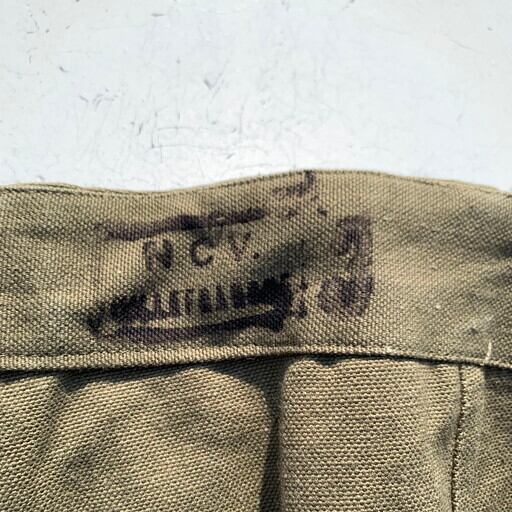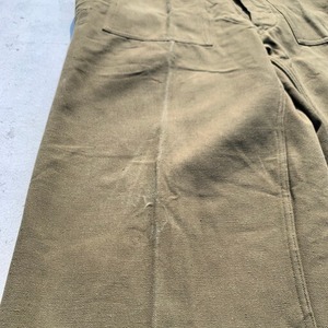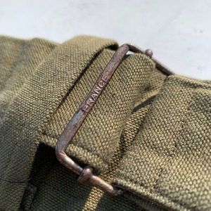40年代頃のフランス軍モーターサイクルパンツです。しっかりとしたコットンのキャンバス地で、フロントはフックにアルミボタン。FRANCEの文字が入った同素材のベルトで調整できます。裾にも絞れるストラップ付。マリンパンツのような四角いパッチポケット仕様で、バックにはポケットは付きません。前面内側は生地が2重でダブルニーとなっています。本来はバイクに乗る際に履いているパンツの上から着用するオーバーパンツですので、サイドから内側へ貫通したポケットがございます。センタープレス跡に色落ちが見られ、ダック地特有のアタリも見られます。擦れなどはございますが、大きなダメージはございません。サイズ表記は3で、W40相当ですが、ウエストをギュッと絞って穿いていただくとワイドなシルエットが強調されワンランク上のコーディネートを楽しんでいただけます。