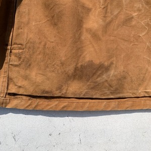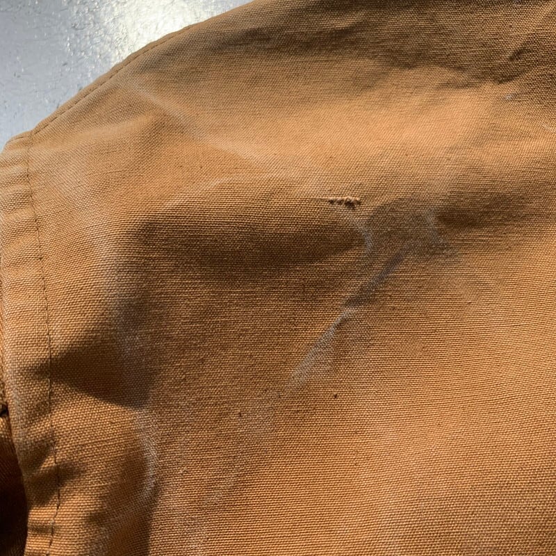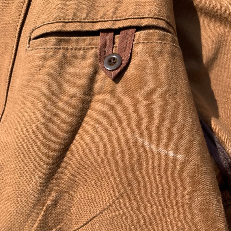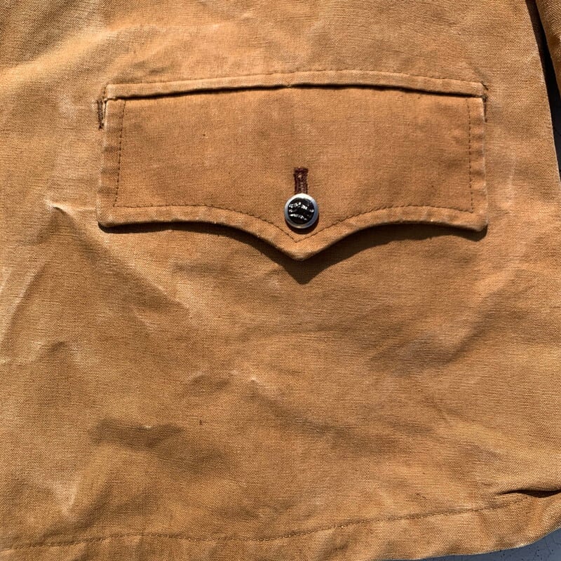 50年台頃のROYAL HUNTERダックハンティングジャケットです。張りのあるブラウンダックを使用したこちらは、メタルで縁取られた動物モチーフのボタンが特徴です。1箇所フレンチピケのハンティングジャケットにしようされている通常の小ぶりな動物ボタンに付け替えられています。ダック地特有のアタリが出ていて無骨な雰囲気が非常にかっこよい1着です。全体に擦れやアタリなどございますが目立つ大きなダメージはございません。内側から見るとゲームポケット付近に黒ずんだ染みがございますが、表からはあまり目立ちません。サイズはL位で少し肩幅が広く感じます。ダック地のハンティングジャケットはあまり出ませんので、ユーロワークウェアなどお好きな方は是非いかがでしょうか。