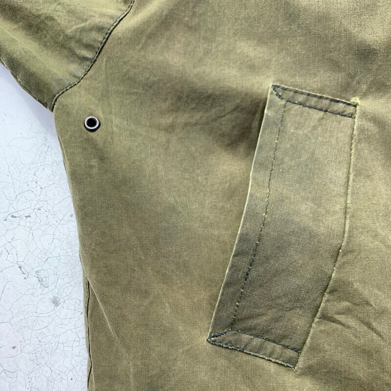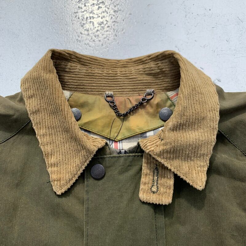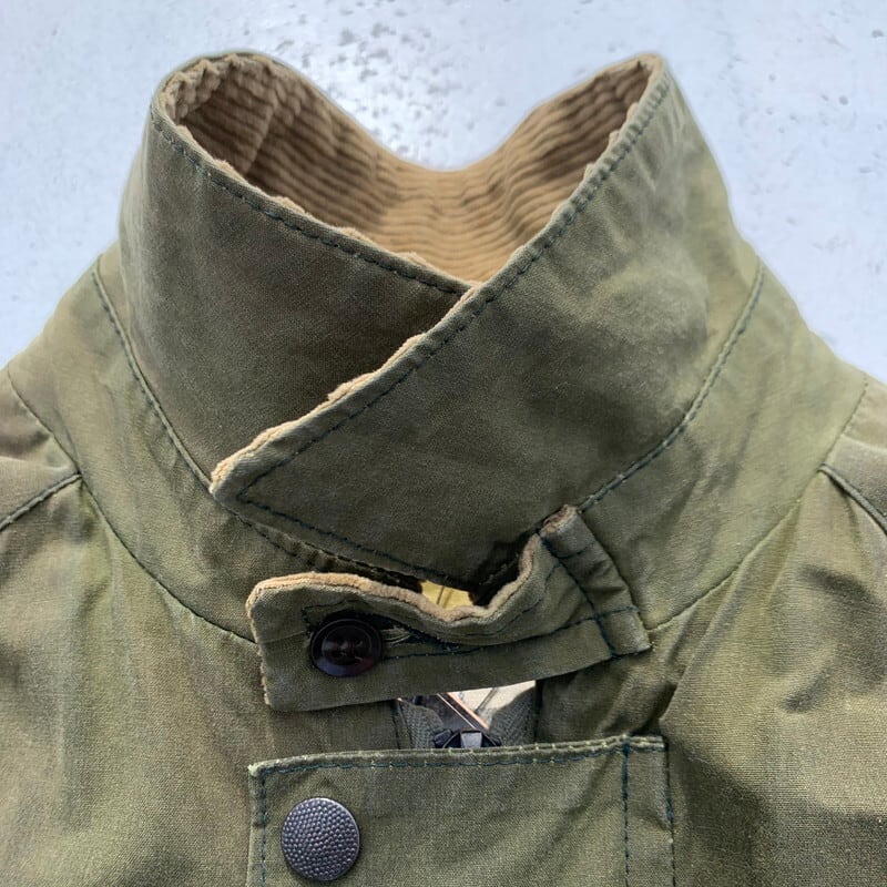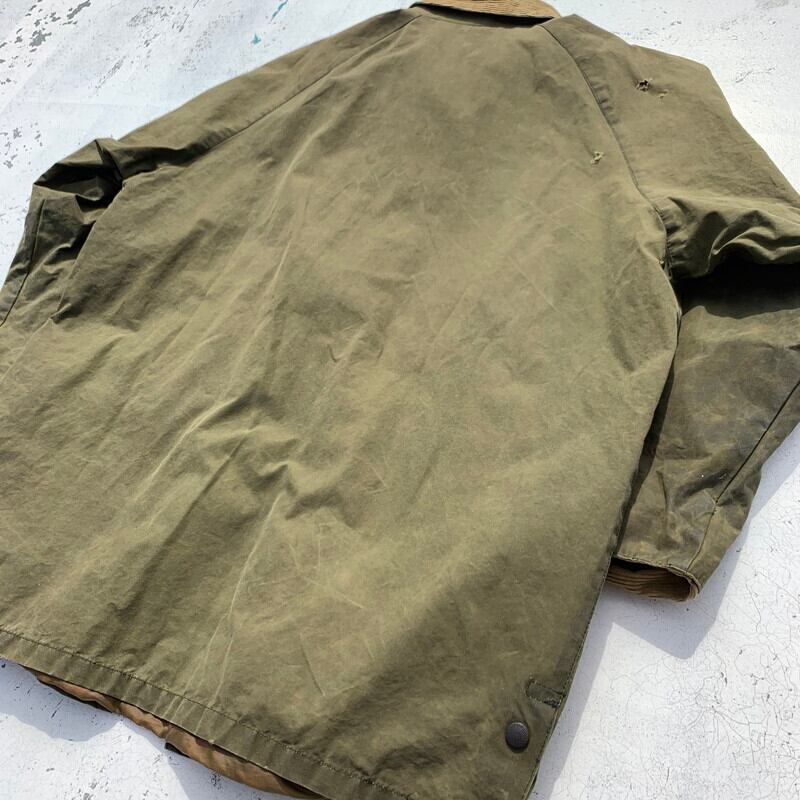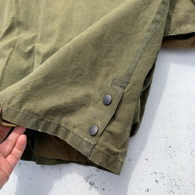 90年代頃のSCIENCE WORLD CLOTHINGオイルドワークジャケットです。1984年にTim Wallingerが設立した知る日とぞ知る英国ブランドです。職人気質名なデザイナー自身が縫製していたりと拘りの強いブランドです。マルセルラサンスが別注かけたりもするようで、ムートンジャケットやモッズコートが有名です。こちらのオイルドジャケットは程よくオイルの抜けた風合いがヴィンテージライクで、バブアーなどとはまた違った味わいです。肩周りに小穴などのダメージがございます。ライナーはございません。オイルドジャケットを製造しているメーカーは多数ございますが、SCIENCEはその中でも古着市場での出現率も低く、コレクターも存在しますので、まさに希少なアイテムといえる1着です。