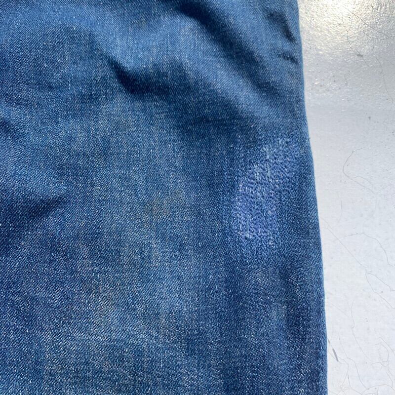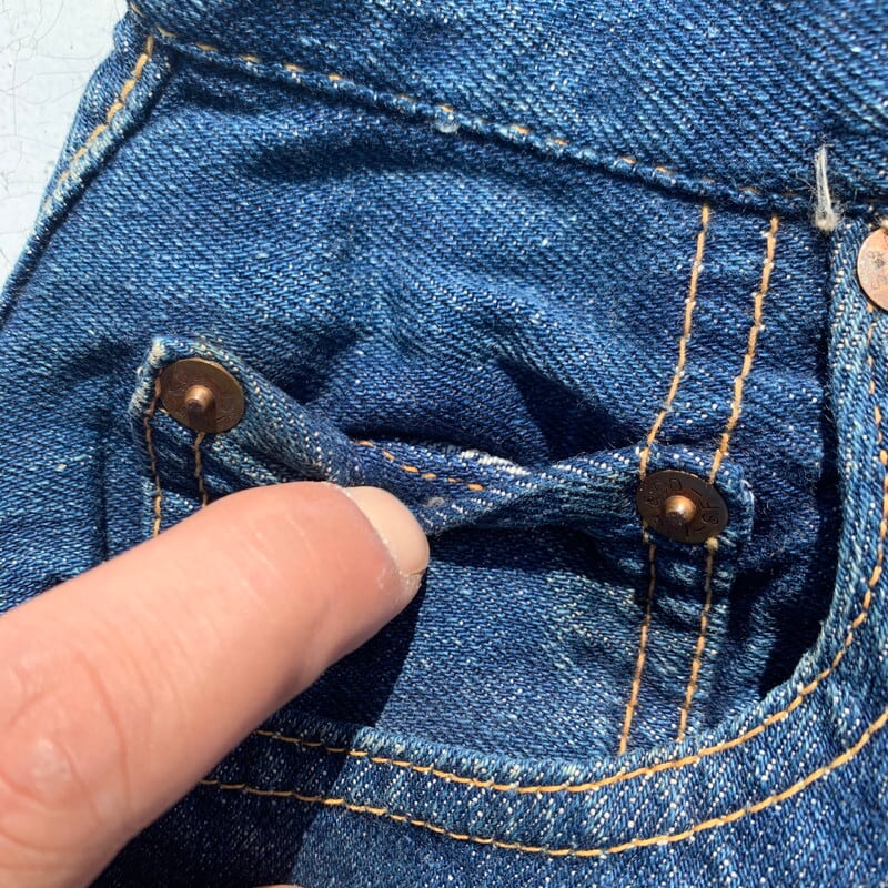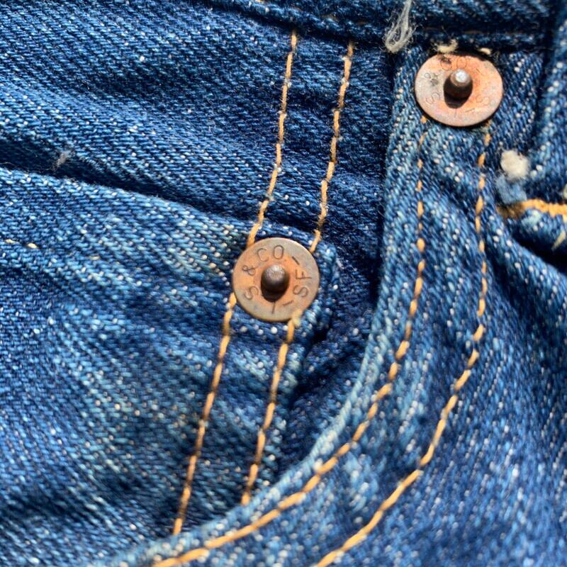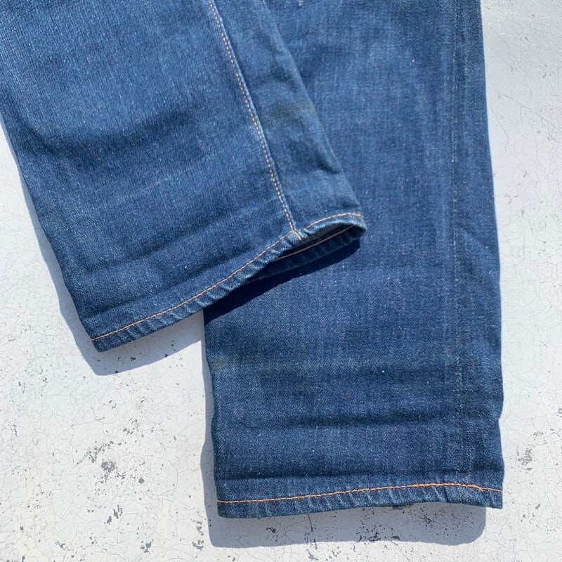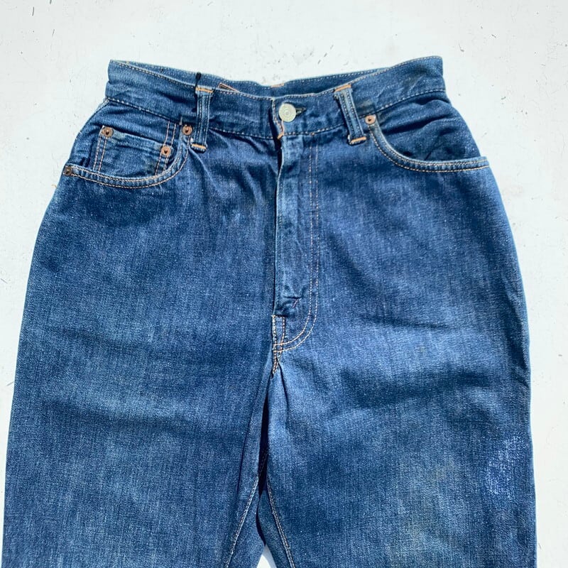 50年代頃のLEVI'S701オリジナルデニムです。501XXの女性用ジーンズとして誕生したモデルがこの701です。フロントVステッチ、GRIPPER社のカムロックジッパー、ウォッチポケット裏シングル、トップボタン裏フラット、ドット刻印(ポツポツ)、スレーキ銅リベット、隠しリベット、サイド脇割り、オフセットループ、両面赤タブ、Big E、均等V。1930年代にデュードランチと呼ばれる牧場観光用に作られたとされ、映画やプライベートでマリリン・モンローが着用していたことで人気を博し現在に至るまでモンローデニムと呼称されているのはあまりに有名なエピソードです。生地は少しライトオンスのデニムを使用しています。隠しリベットが付きますが、50年代頃は布パッチが使われ表記は701でXX表記は付きません。しかし古い年代のXX同様に深い色見で、色落ちに大差は無いので経年変化も楽しめます。右ひざと左腿にリペアが有り、左裾から10cmほどに裂けた箇所を縫い合わせててあるので、裾幅が左右で違います。レングスが長いのでロールアップすれば気にならないと思います。布パッチは欠損し、リペアはございますが、色残りも8~9割残った濃紺の個体です。サイズはW25~26。501XXの紙パッチギャラ有りと同年代のデニムとしては手頃な価格ですので、お探しだった方も多い701のオリジナルを手にして頂きたいと思います。