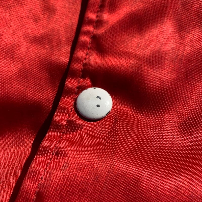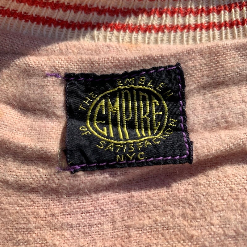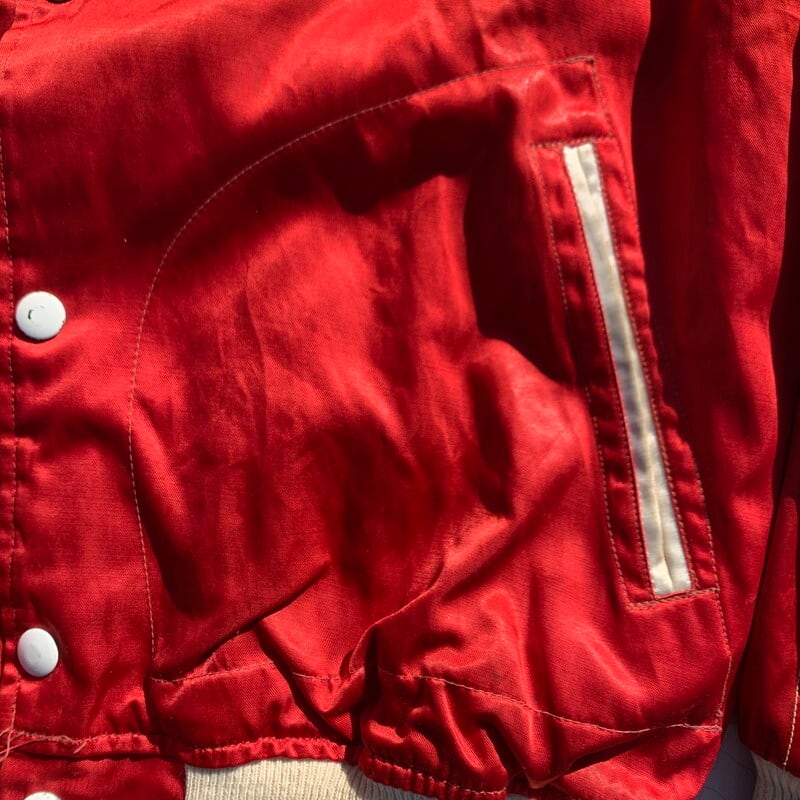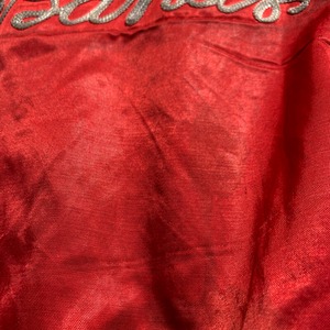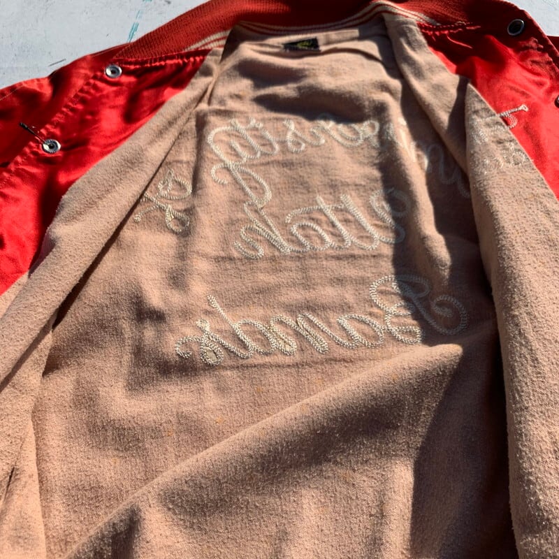 40年代から50年代頃のEMPIREサテンスタジャンです。背面にチェーンステッチでUNIVERSITY OF UTAH BANDSとあることからユタ大学のマーチングバンドの一員が使用していた物と思われます。胸元にはトランペットとネームが入るのでトランペットの演奏者だったのかも知れません。綺麗なで発色の良い赤いサテン地で、古いものなので薄いしみなどはございますが、、ダメージなども少なく比較的状態は良好な1着です。リブはすべてコットンを使用していて丈夫ですが、ニット生地のものに比べ伸縮性は劣ります。サイズは36~38位。女性でも着やすいサイズかと思います。春先のライトアウターとしてオススメです。