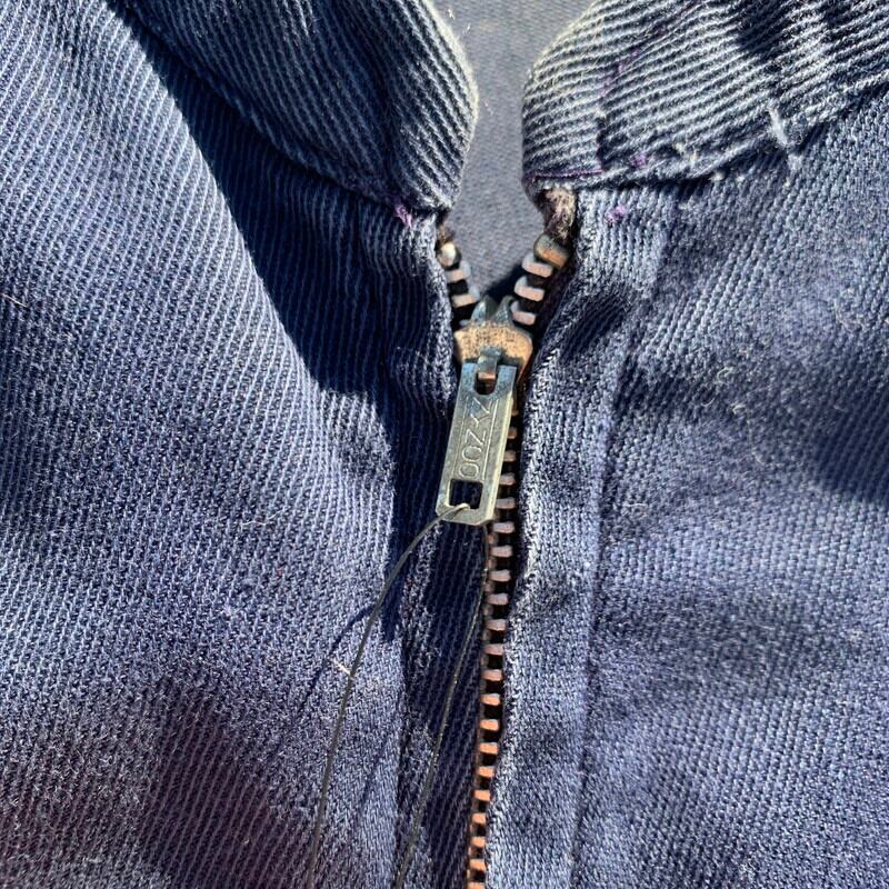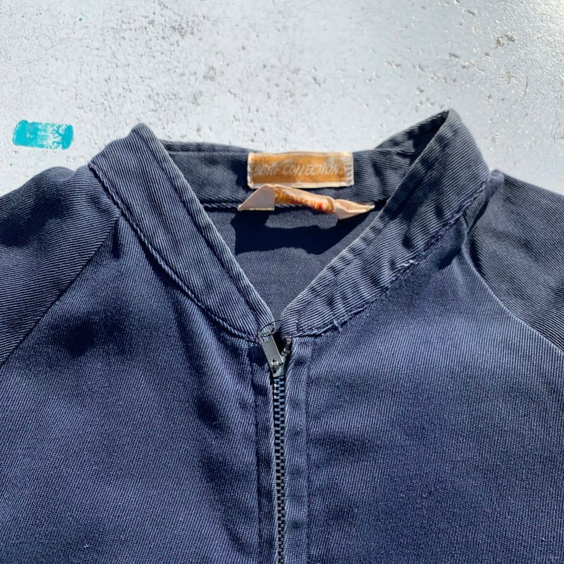 60年代頃のJantzenコットンジャケットです。1916年に誕生した水着ブランドです。SURF COLLECTIONというシリーズの1着で、当時大流行したサーフィンを意識したラインと思われます。一見スウィングトップの様ですが、スタンドカラーに袖と裾にスポーティーな2本のラインが施されており、どこかカレッジ物を彷彿させるデザインです。ジッパーはNYNCOというメーカーのアルミのピンロックが使用されています。襟周りから肩にかけて若干日焼けが見られ、全体的に使用感がございますがダメージなどはございません。春先にちょうど良い羽織物として重宝する1着です。