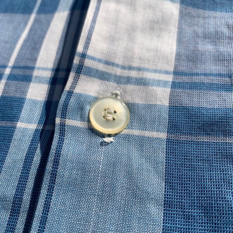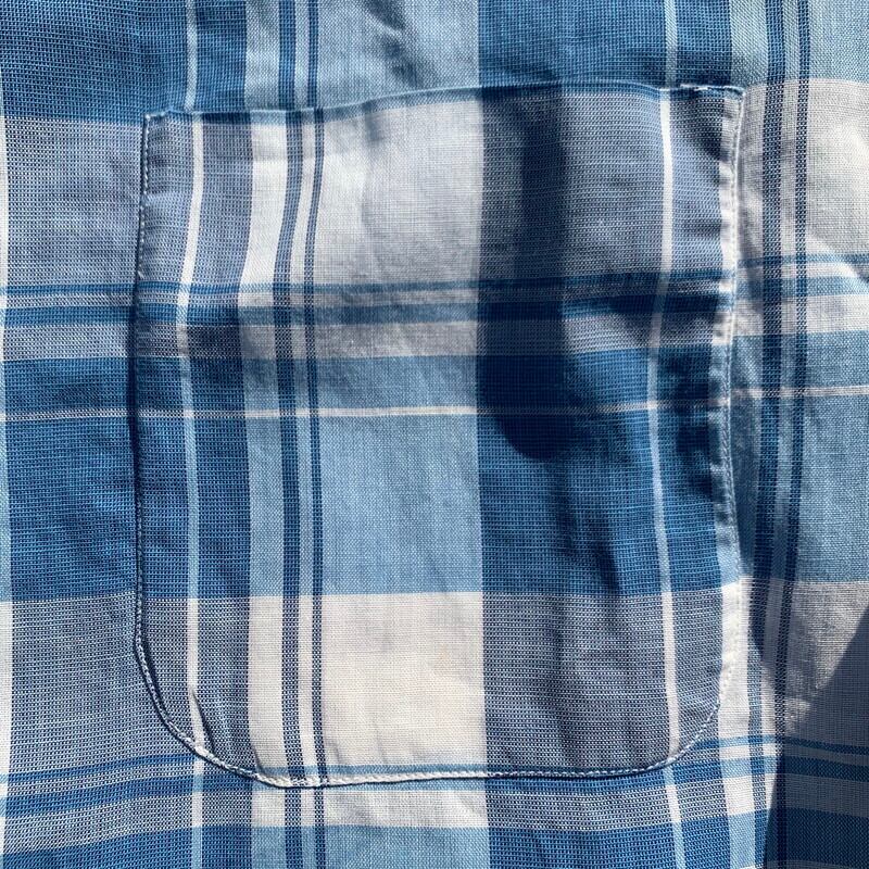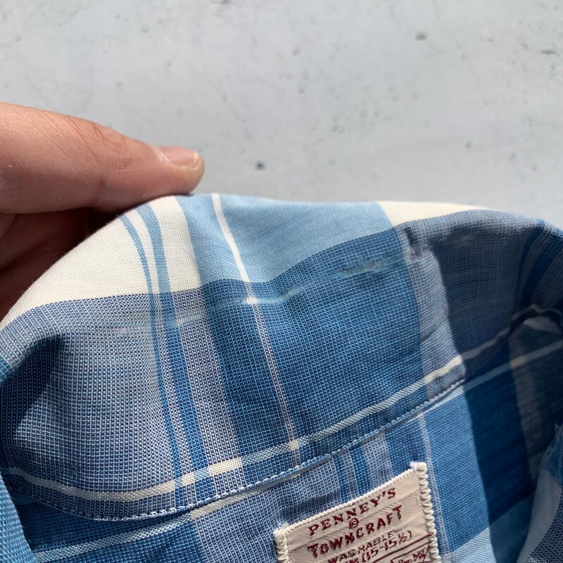50年代頃のPENNY'S TOWNCRAFTオープンカラーチェックシャツです。アメリカ3大ストアと呼ばれるJCPennyが展開していたプライベートブランドです。Galey&Lord社の生地を使用した別注品です。さらっとした薄手のコットン地で淡いブルーのチェックが爽やかな一着。襟芯は入らずサイドはダブルステッチ。ボックスシルエットですので、合わせやすくゆったり目のチノパンなどとも非常に相性のよいシャツです。襟元に擦れによるダメージがございますが、その他はダメージや汚れも無く良好です。サイズもM相当ですので、ゴールデンサイズです。これからの季節に使える1軍シャツですので、オススメです。