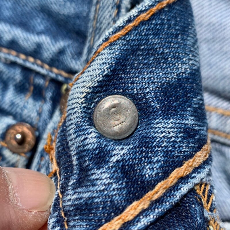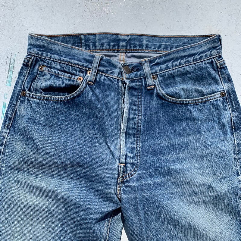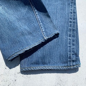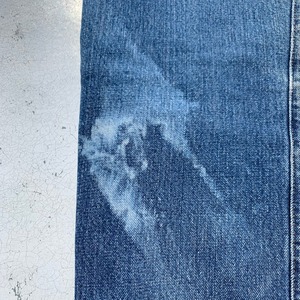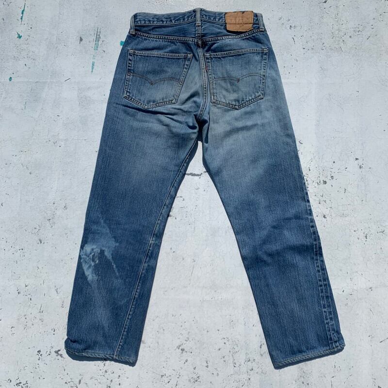 60年代から70年代頃のLEVI'S501 Big Eデニムです。トップボタン裏刻印6、フライボタン足長R、平行ステッチ、ウォッチポケット裏チェーン、アウトシームセルヴィッジ裏両面シングル、バックポケット裏シングル、赤タブBig E。Big Eの中では中期から後期あたりのモデルと思われます。全体に色落ちがあり、4~5割色が残っています。パッカリングもしっかり出ています。裾はオリジナルではなくチェーンステッチで裾上げされています。腿辺りに小さなピンホールが有り、左ふくらはぎ辺りにはブリーチ跡が見られます。リペアこそございませんが、若干レングスが短めです。春から夏にくるぶしを見せたスタイル等に使いやすいレングスです。ウエストもW30ですので、女性も穿きやすいサイズです。Big Eもかなり高騰していますが、色身が薄いものはまだ比較的手に入れやすい価格ですので、サイズが合う方は是非いかがでしょうか。