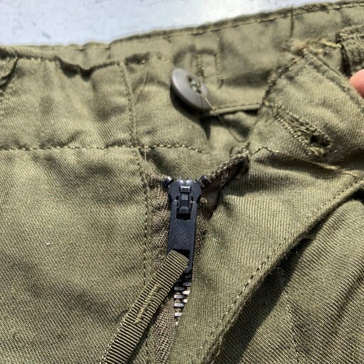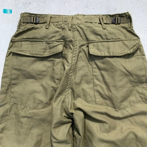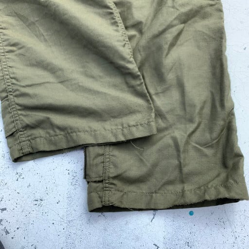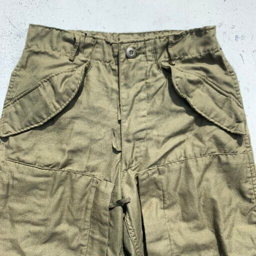 70年代初頭のU.S.ARMYノーメックスヘリクルーパンツです。難燃繊維のノーメックスを使用し、ベトナム戦争時に採用されていたモデルです。ハンドウォーマーポケットはボタン仕様、両腿についたマチのあるポケットは両サイドから物を入れる2週構造となっており、フロントジッパー同様にダブルジップ仕様となります。かがんだ状態でも取り出せるよう膝下にもポケットが施されています。裾はベロクロで幅の調整が可能です。生地は薄めでシルエットもやや細身の為野暮ったくなくスマートに合わせていただけます。サイズは希少なX-SMALL。女性にもオススメしたい1本です。