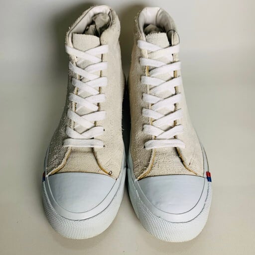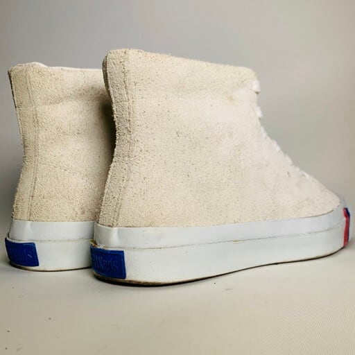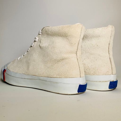 80年代から90年代頃のPRO-Keds ROYAL NO,1です。スポーツシューズブランドでは珍しいコロンビアでの製造を行っており、90年代頃にコロンビアでの製造が終了するにあたり、藤原ヒロシ氏が「ラストコロンビア」と呼んだ事で注目されるようになったという逸話があまりにも有名です。オフホワイトのスエードを使用しており、トゥにはラインが入りません。若干の使用感はございますが、まだまだ綺麗です。内側はレザーのライニングでアンクル部分はスポンジが入っていますので足首にフィットしやすくなっております。近年、当時のコロンビア製は中古相場でもなかなか出なくなり、状態の良い物は希少です。サイズもUS8.5とゴールデンですので、プロケッズファンの方は必見のアイテムです。