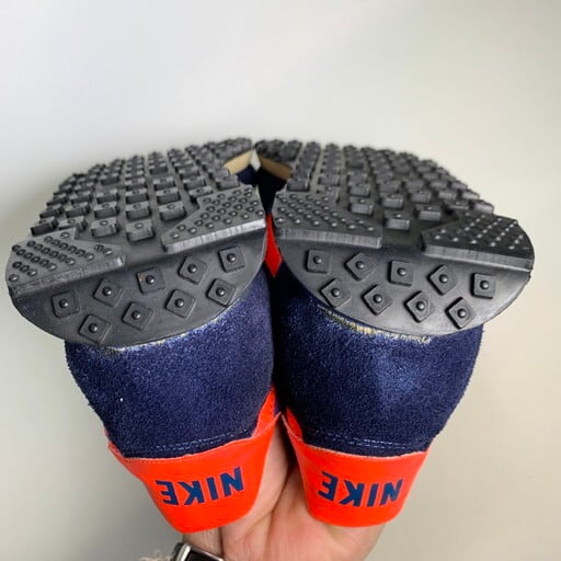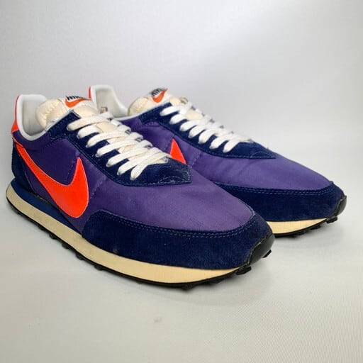 70年代のNIKE WAFFLE IIオリジナルです。1971年にNIKE創業者のビル・バウワーマンが朝食の際ワッフルメーカーを見て閃き、誕生したワッフルソール。1972年ごろには市販品として宇宙飛行士の月面着陸時の足跡に似ているということからムーンシューとし販売。オレゴンワッフルやワッフルレーサーなどに続くワッフルシリーズとして生まれたのがこのワッフル2です。パープルに発色の良いオレンジが目を惹く1足。試着程度のデッドストックで地図箱が付属します。保管によるシミが若干見られ、左アッパーに薄汚れがございます。ソール表面がやや硬くなりかけていますが、スポンジもしっかりとしており、ソールをしなっても問題ございません。シュータンのスポンジやアーチクッキーもふかふかです。US9.5とゴールデンサイズです。箱付きのデッドストックは今後市場でもなかなか出ないと思われますので、NIKEコレクターの方にオススメしたい1足です。※ヴィンテージ品の為、表からは見えない内部劣化がある場合がございます。あくまで観賞用としてお買い求めください。