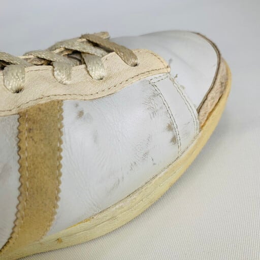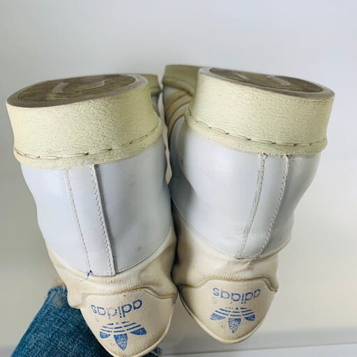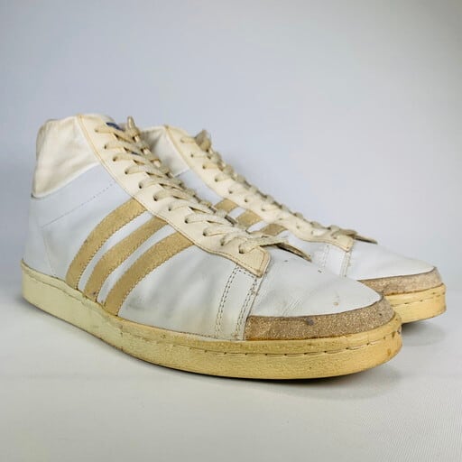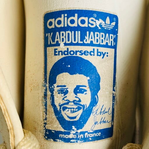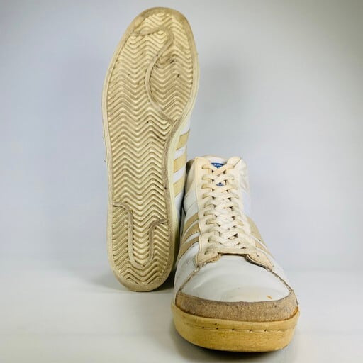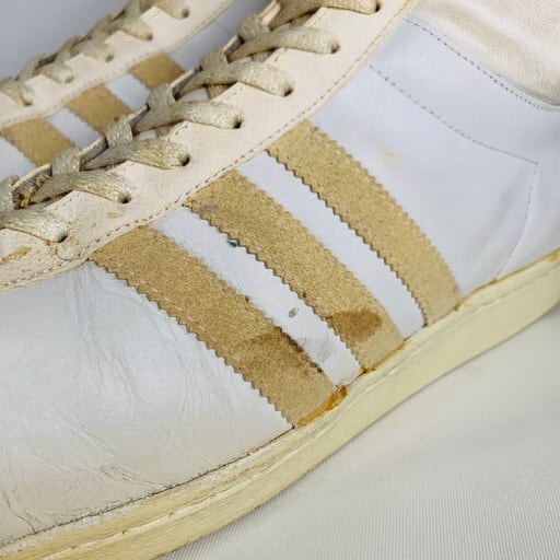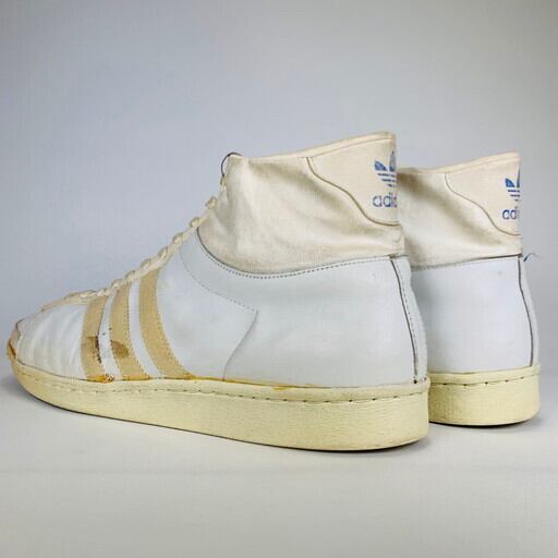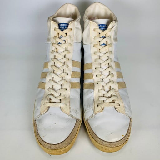 80年代頃のadidas K.ABDUL JABBERです。1979年に登場したこちらはNBAの第一線で20年間活躍したカリーム・アブドゥル=ジャバーのシグネイチャーモデルです。シュータンには彼の顔がプリントされた後期型。ホワイトレザーにベージュ(クリーム?)の3ストライプカラーでシンプルなデザインですが、シュータンとヒールのトレフォイルマークがブルーというバランスがクールな1足です。シミなどは身ら得ますが、大きなダメージなどはございません。今では希少なフランス製です。サイズはUS13とビッグサイズではございますが、年代を考慮しても状態は良好です。コレクションやディスプレイ用にいかがでしょうか。※年代物のシューズですので、表面からは見えない内部劣化がある場合がございます。あくまで、観賞用にお買い求めください。
