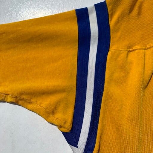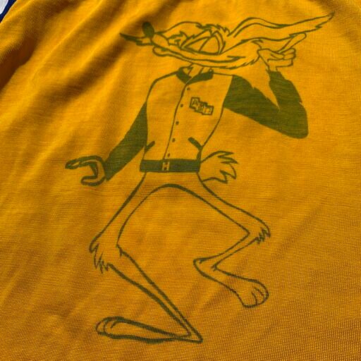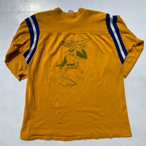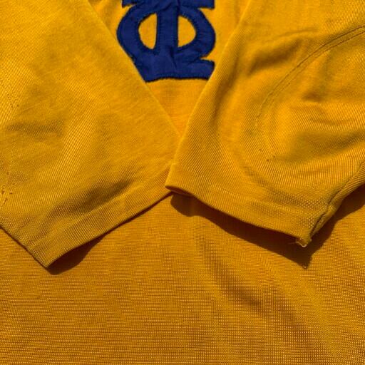 60年代頃のEMPIREレーヨンフットボールTeeです。1930年代には創業していたとされ、主にベースボールなどのアスレチックウェアを製造していた老舗ブランドです。イエローボディにブルーとホワイトのラインが綺麗な1着です。ΑΦΩ(アルファファイオメガ)とは男子学生社交団体とされる大変大きな規模のフラタニティとして有名な団体です。現在では女学生なども活動しているようです。背面にはΑΦΩの文字が描かれたジャケットを着たコヨーテ(狼?)が染み込みプリントされています。プリントの下部にハンドステッチでのリペアがございます。ゆったりとしたサイズでざっくりときていただけます。オーバーオールなどと合わせても良いと思います。