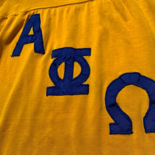 60's EMPIRE エンパイア レーヨンフットボールTee イエロー ブルー バックプリント ΑΦΩ フラタニティー 男子学生社交団体 L~XL リペア USA製 希少 ヴィンテージ BA-873 RM1242H