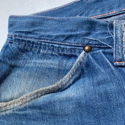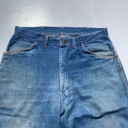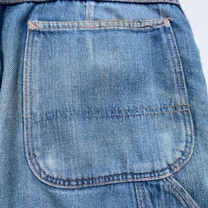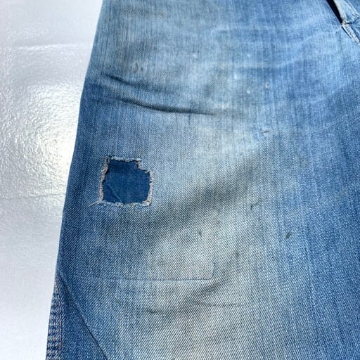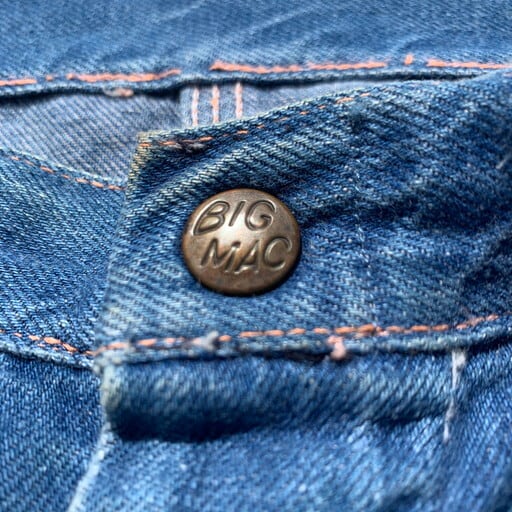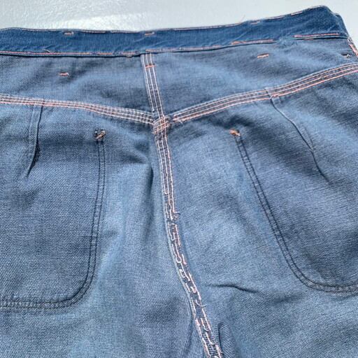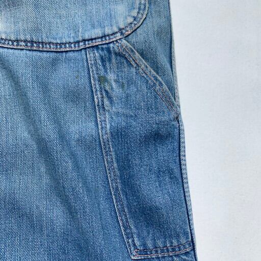60年代から70年代頃のBIG MACデニムペインターパンツです。アメリカ3大ストアブランドとして有名なJCPennyが手がけるプライベートブランドです。全体に色落ちが見られ、色残りは4~5割程度。右腿に小さなダメージとリペアが3箇所確認出来ます。左ウエスト背面にも1箇所リペアがございます。バックポケット内側にウエストのボリュームを押さえる為ダーツがポケットに隠れるように入っております。ヨークステッチの下から入っていることから、オリジナルで元々入っているタイプなのかもしれません。くたっと柔らかいデニムでイージーパンツのような感覚で履き易い1本です。サイズもW32と良いサイズ感ですので、オススメです。ヴィンテージペインターパンツも年々価格も上がってきていますので、サイズの合う方は是非いかがでしょうか。