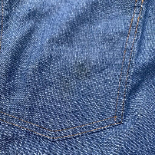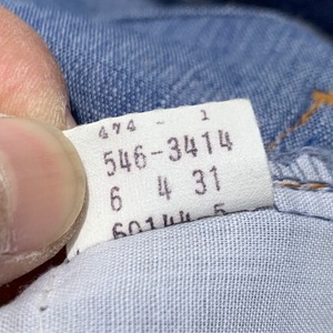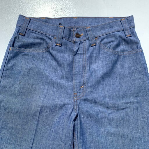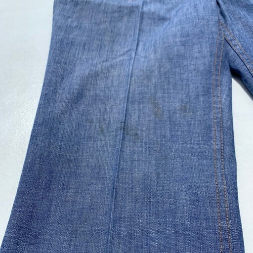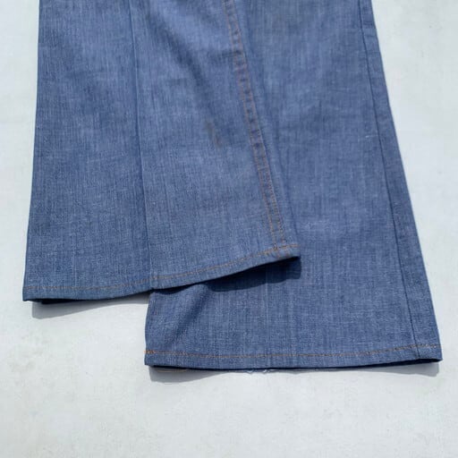 70年代のLEVI'S546-3414シャンブレーパンツです。ライトオンスのシャンブレー素材でブーツカットのように裾がやや広がったシルエットです。刻印31、42TALON使用。スレーキには元々Levi's for menというタグが付いていたようですが欠損しています。うっすらと膝付近にシミ、裾に若干のいダメージがございます。バックポケットには、Big Eのオレンジタブが付きます。しみ等はございますが、比較的状態は良好です。シャンブレーですので春から夏にかけて使いやすい1本です。W32。