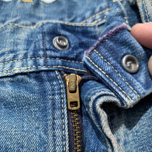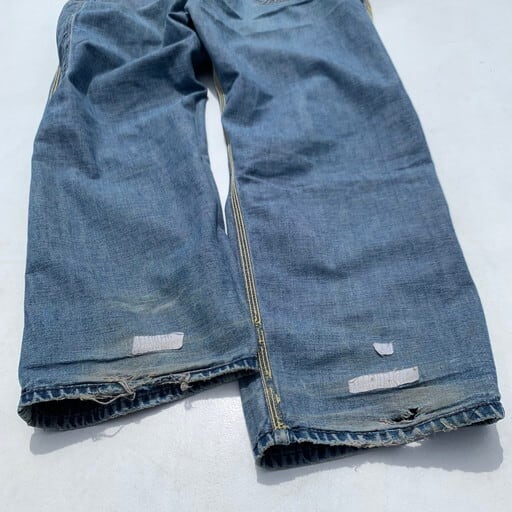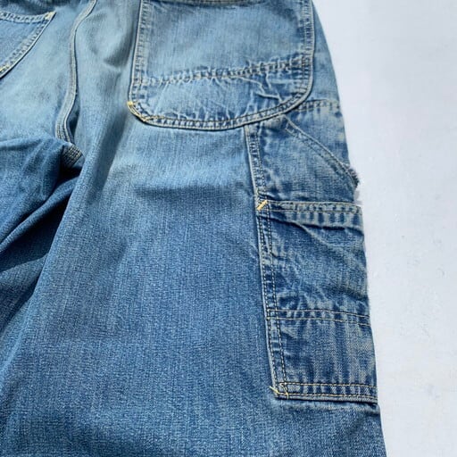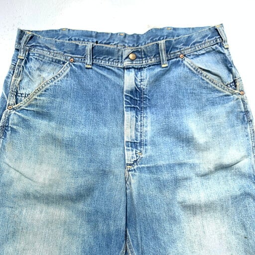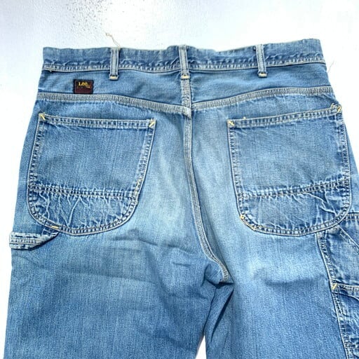 60年代後半頃のLee191Zデニムペインターパンツです。へヴィーオンスのJELT DENIMを使用しているこちらはバックサイドに赤タグが付き、®、MR、UNION MADE IN USA表記有りで、60年代の最終期頃に製造された物と思われます。全体に色落ちしており、色残りは3割ほど。フロントジッパーは42TALON使用。両膝にリペアと補強が施されております。右膝にボンド跡のようなラインが見受けられます。裾は両方ともややダメージがあり折返し部分にリペアが見られます。右のバックポケットのステッチが一部解けています。これからの季節に半袖スウェットなどと合わせても良い色落ち加減です。ヴィンテージLeeのペインターパンツは市場の人気の高さ故に入手も難しくなってきています。ゆったりとしていますが、シルエットは綺麗ですので、オススメです。W38位。