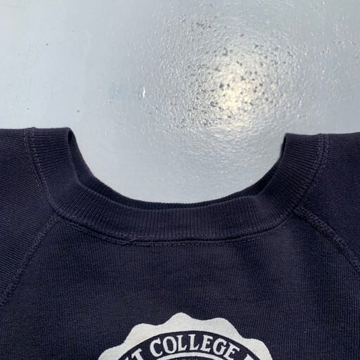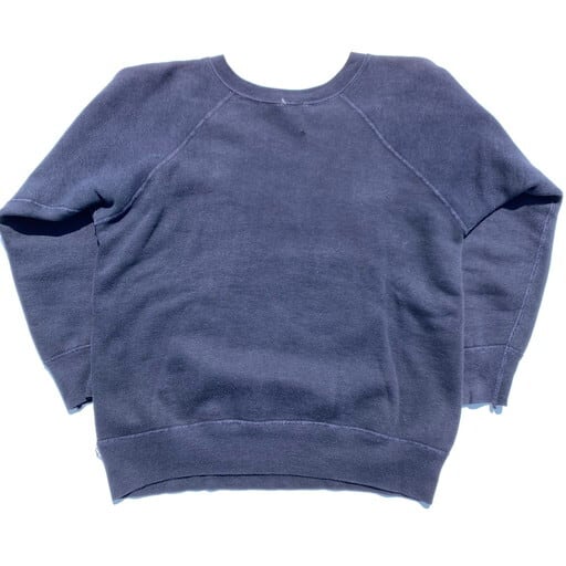 60年代頃のChampionラグランスウェットです。インCと呼ばれるランタグが付きます。フロントはフロッキープリントですがフロッキー特有の立体部分はほとんど取れてしまっています。襟元2本針、その他は4本針。 シルエットは袖を広げるとT字になりますので、50年代後半から60年代にかけて頃のものと推測しています。色あせも少なく濃いネイビーで背面にある小さなダメージ以外は状態良好です。表記サイズはMEDIUM。メンズのS~M位です。女性にも合わせやすいサイズです。ナス紺になるまで育てたくなる1着です。状態の良いヴィンテージチャンピオンはなかなか見つかりませんので、この機会に是非いかがでしょうか。