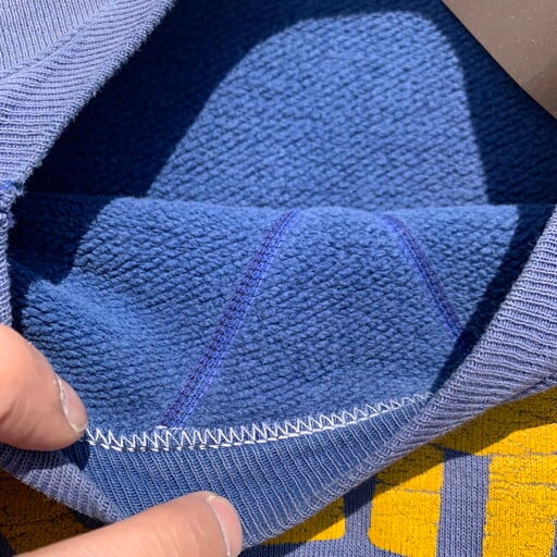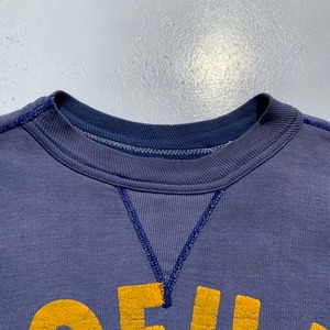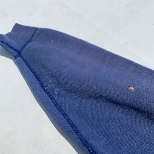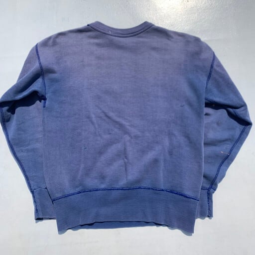 50年代頃の前Vセットインスリーブスウェットです。タグは欠損していますが、縫製や生地感から、一つ前にご紹介したRussell Southern社のものと思われます。貼り付けガゼットに光沢のあるステッチ、フロントにはペンキプリントが入ります。こちらの個体シルエット的がやや縦長となっています。全体にフェードしており、ナス紺カラーが良い味だしています。右袖と背中にピンホールを補修した後がいつくか有り、左袖のリブはステッチが解けたのかハンドステッチで補修されています。サイズはメンズのM位で着丈もございます。デニムはもちろんミリタリーパンツとも相性は抜群です。キングオブアメカジと呼べる王道カラーですので、オススメな1着です。