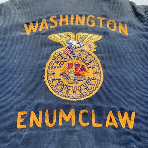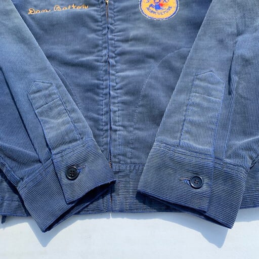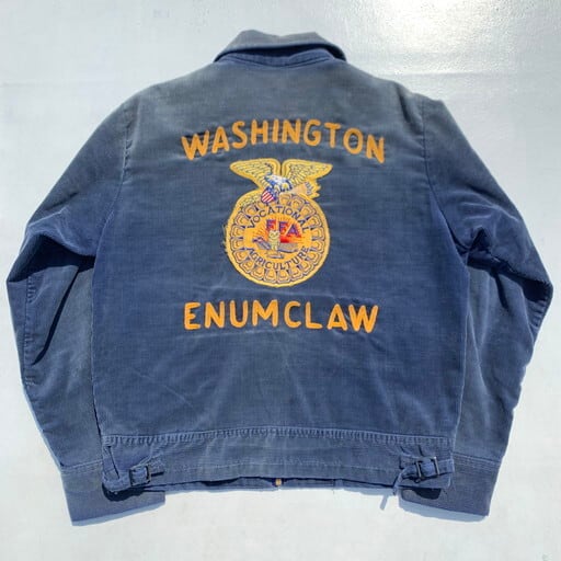 70年代から80年代頃のFFAコーデュロイジャケットです。Future Farmars of Americaという1925年にバージニア州で設立されたアメリカ国立農業学校のユニフォームです。デザインもほとんど変わる事なく現在も使用されています。フロントはTALONジッパー、胸元にはワッペンとネームのステッチが入ります。背面にもお馴染みの大きなワッペンとチェーンステッチが入ります。FFAジャケットは鮮やかなブルーまたは濃いネイビーですが、全体にヤケが入りグレーっぽいヴィンテージライクな色合いへと変貌しています。サイズは小さい物が多いなか希少な40。メンズのL位ですのでまさにゴールデンサイズです。雰囲気系のヴィンテージがお好きな方に是非ともお勧めした1着です。