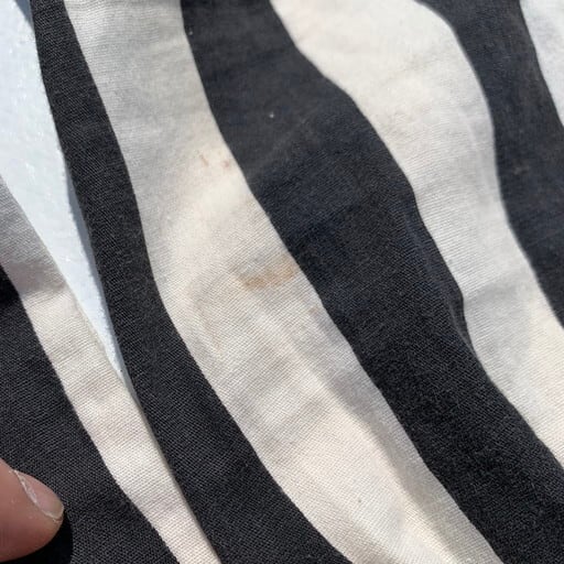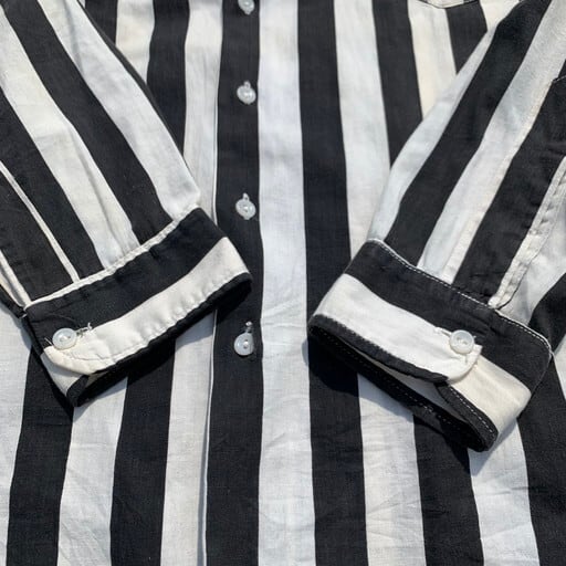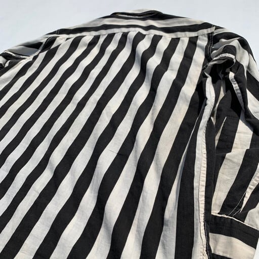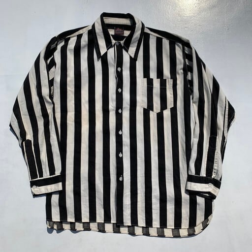 40年代から50年代初頭頃のMac Gregorレフェリーストライプシャツです。1936年にP.Goldsmith&SonsがMacGregor Golf CompanyとMcGregor&Canby Companyをを買収し、1944年頃から社名にMac Gregorを追加しました。1952年には社名からGoldSmithが削除されMacGregorという単体の社名へと変更したそうです。こちらの商品は、Mac Gregor GoldSmith表記のタグが付く事から1944年から1952年のわずか8年間の間に製造されていたものと思われます。黒と白のストライプ柄で、スポーツの審判が着用していたレフェリーシャツです。通常のアパレル用品では無く審判用ということもあり当時の生産量も極めて少なかったと思われます。フロントは1ポケット、サイドにはマチがございます。うっすらと汚れはございますが、目立つダメージなども無く良好です。サイズ表記はございませんが、XL相当です。ゆったり目にざっくりと合わせていただけます。古着市場では人気の高いレフェリーシャツですが、出現率の低いアイテムですので、お探しだった方は必見です。