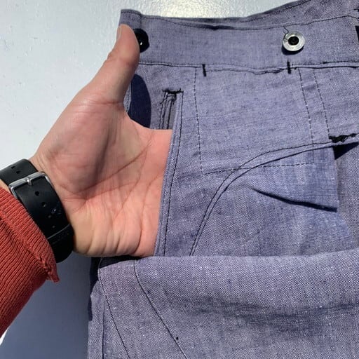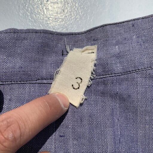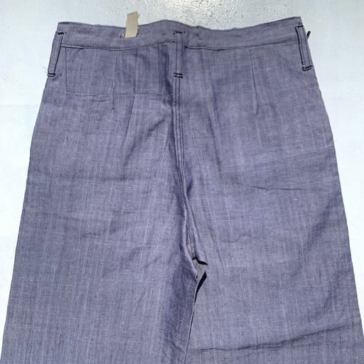 50年代頃のフランス海軍ラミーセーラーパンツです。水も通っていないデッドストックと思われます。ラミーとは麻の一種、芋麻の事で、リネンよりコシがあり、水に濡れるとより強度が増す性質で水に近い海軍には最適の素材として採用されたようです。フロントのフラップ下にはベルトループと、両玉縁のスラッシュポケットがございます。フロントに保管時についたと思われるオレンジっぽい汚れがみられます。探されている方も多いゆったりとしたワイドシルエットです。ラミーセーラーシャツは比較的古着市場でもたまにみかけますが(それでも数は少ないです)、こちらのセーラーパンツはあまり流通していな希少なアイテムです。ウエストはW34くらいでゴールデンサイズ。デッドストック物は今後入手困難になると思われますので、この機会に是非いかがでしょうか。