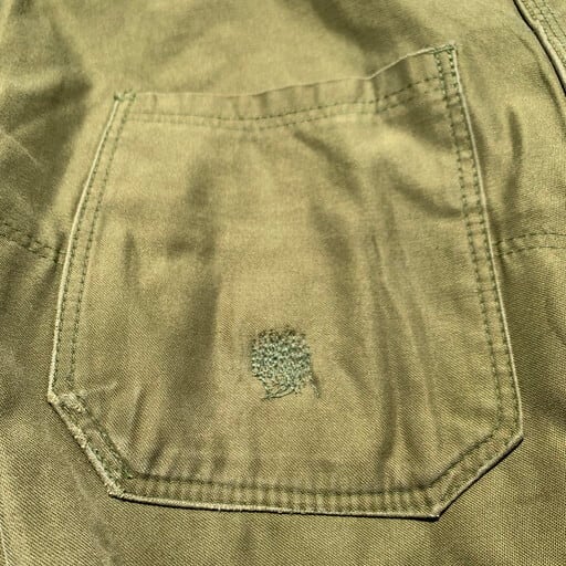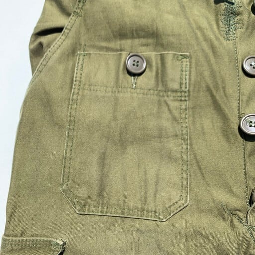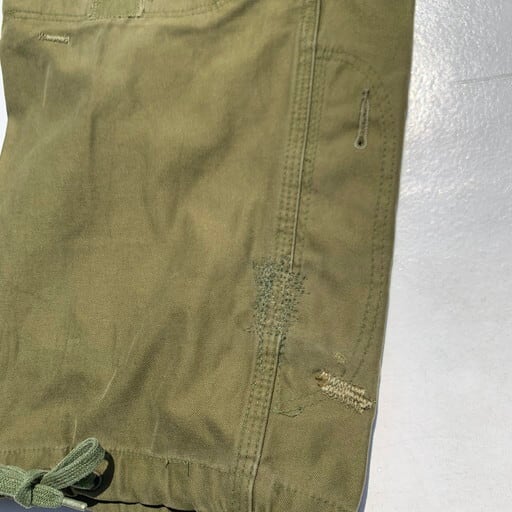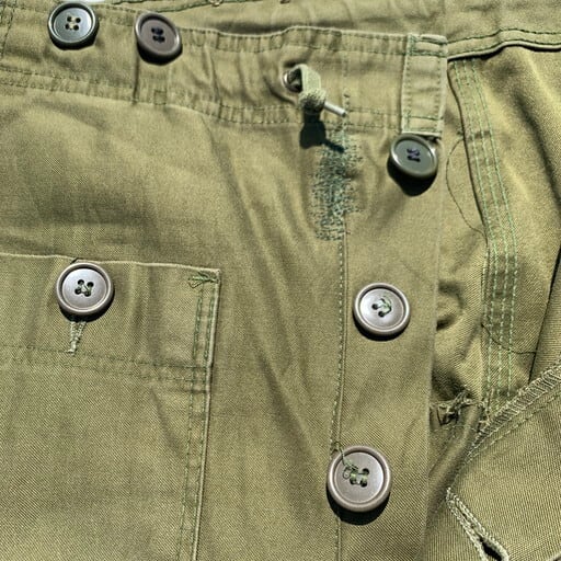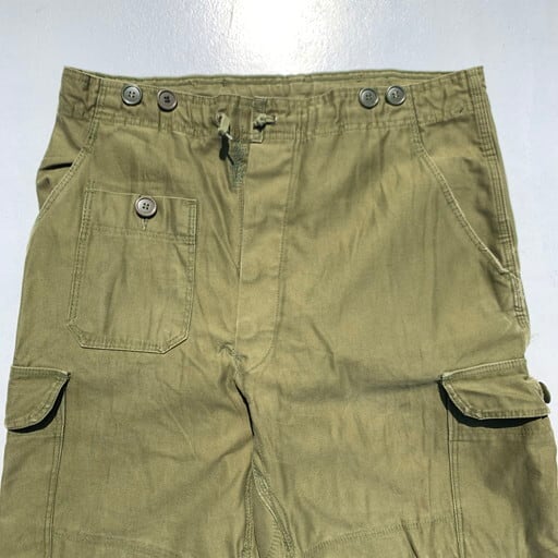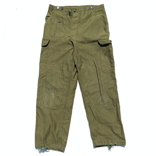 70年代前後頃のデンマーク軍カーゴパンツです。ヘリンボーンツイルではないコットンツイルのタイプです。ウエストにベルトループは無く紐で調整いたします。ダブルニ-仕様で生地の内側に強度を上げる為か紐のような物が埋め込まれています。全体的にあちこちにリペアがあります。かの有名なマルジェラでもこのモデルをサンプリングしたことがあるそうです。シンプルながらアシンメトリーなデザインが良い雰囲気です。サイズはW37とやや大きめですが、オーバーパンツのようにウエストをぎゅっと絞れますので、穿き易い1本だと思います。
