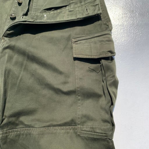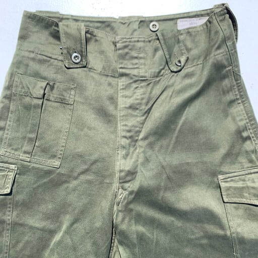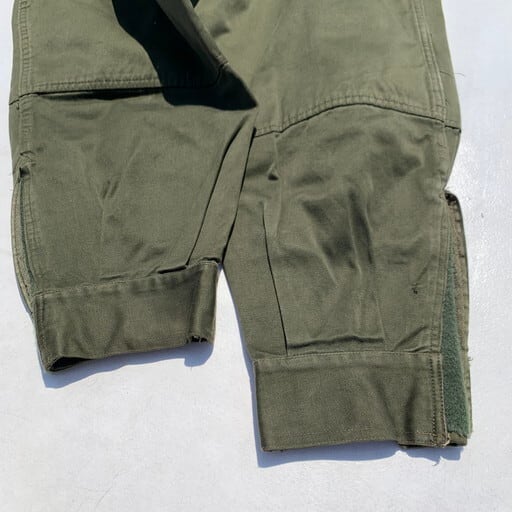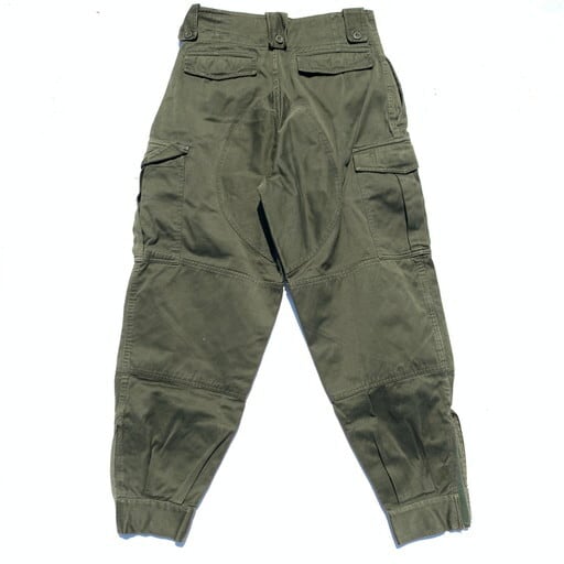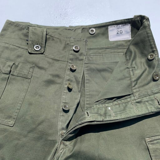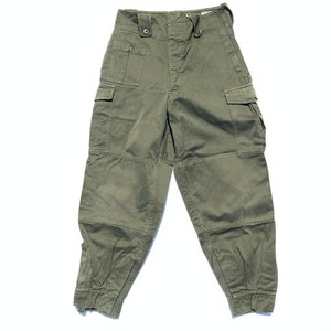 70年代のベルギー軍M-64フィールドパンツです。1971年製。裾にかけてテーパードの利いたシルエットが特徴で、裾はベロクロタイプで開閉、調整が出来る仕様です。しっかりと張りのあるコットンツイル地です。大きなダメージはございませんが、左ベロクロ根元に目立ちにくいリペアがございます。その他は比較的美品といえる1本です。シルエットがユニークでコーディネートの幅も広がるのでは無いでしょうか。ユーロミリタリーも人気が高くなってきていますので、サイズの合う方は是非いかがでしょうか。