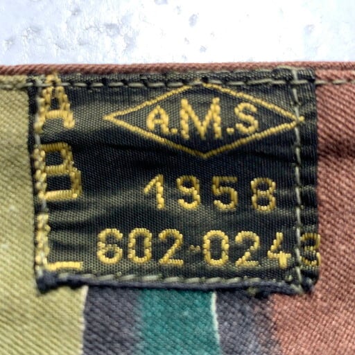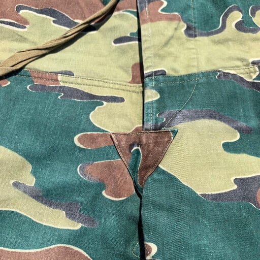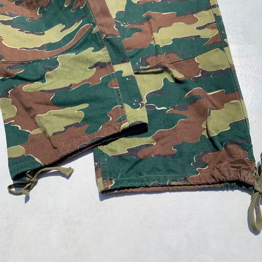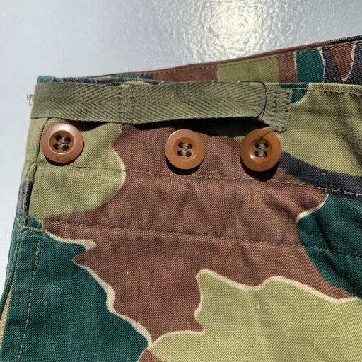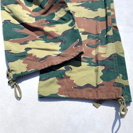 50年代のベルギー軍M58ジグソーカモオーバーパンツです。こちらの前身には今非常に価格が高騰しているブラッシュカモが存在し、そのブラッシュカモのオーバーパンツも2種ございます。フロントがボタンフライではなく生地も柔らかい初期タイプ、次はボタンフライで生地ががっしりとした後期タイプ。そして今回のM58ジグソーと変貌しています。ブラッシュの後期モデル同様に生地ががっしりとしているタイプです。オーバーパンツタイプで大きいサイズが多いですが、ウエストは紐で調整できますので、ぎゅっと絞ればワイドなシルエットがとても旬な1本です。ジグソーカモはまだ比較的価格も安定していますので、今のうちに手に入れておいて損はないかと思います。腿あたえりにうっすら色落ちがございますが、まだまだ美品といえるグッドコンディションです。ユーロミリタリーの人気もあがっておりますので、お探しだった方は是非いかがでしょうか。