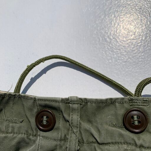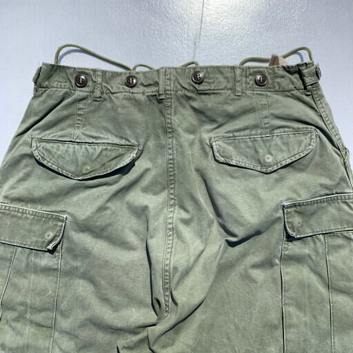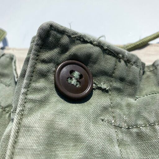 50年代のUSMC M-1951フィールドパンツです。フィールドパンツ言えばU.S.ARMYの物が定番ですが、こちらはその中でも希少種とされるUSMCタイプ。基本的なスペックはさほど変わりはございませんが、ウエストのアジャスターがボタン仕様となります。ウエスト内側フックループはコットンではなくナイロン製のものが取り付けられています。サイドのポケット外側にストラップが付くモデルですが、こちらはカットされています。全体に色落ちしており、右膝に小さなダメージがございます。使用感こそございますが、このフェード感がかえってよい雰囲気を醸し出しています。サイズはLONG MEDIUMとやや大きめですので、体の大きな方でも十分に穿ける1本です。探してもあまり見つからないUSMCタイプですので、お勧めです。