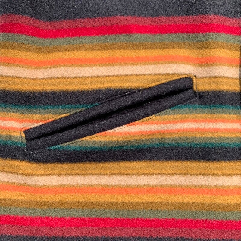 PENDLETONマルチボーダーウールコートです。ブラックに鮮やかなマルチボーダーが目を惹く1着です。内側はThinsulateがしようされている為防寒性も高くなっています。第2ボタンにうっすらヒビが見られますが、その他は比較的綺麗です。ヴィンテージ品ではございませんがデザインの雰囲気も良く、ネイティブファッションなどお好きな方にお勧めな1着です。