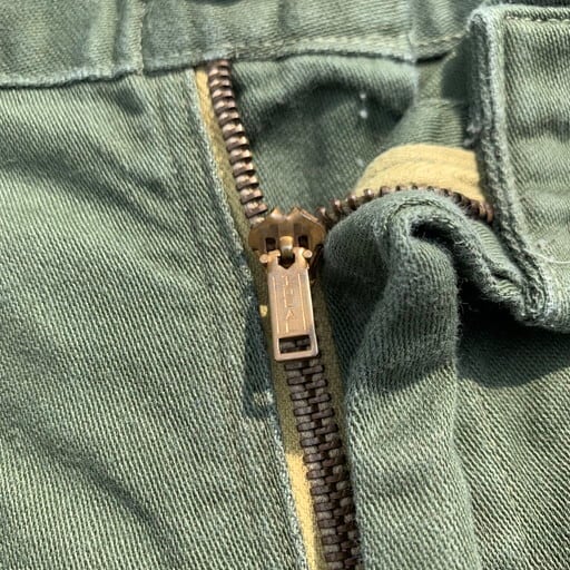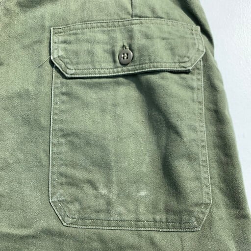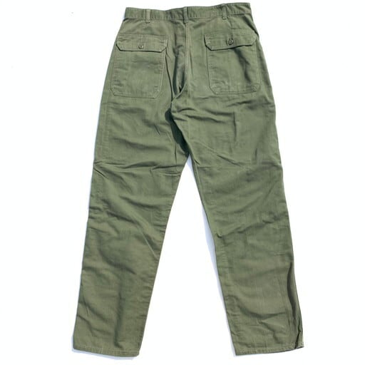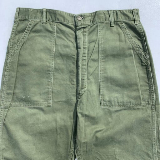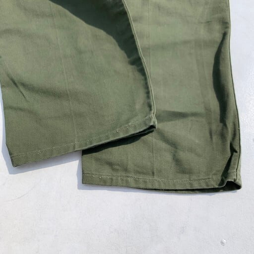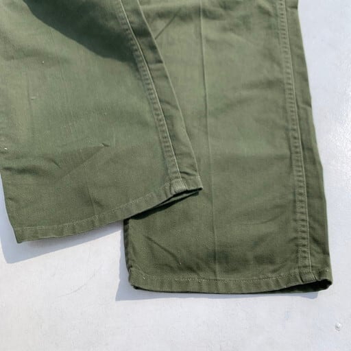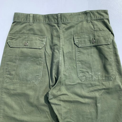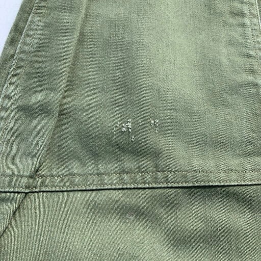 60年代頃のU.S.AIR FORCEベイカーパンツです。内タグ欠損のため詳細は不明ですが、素材はコットンサテンです。フロントはTALONのカムロックジッパー。濃い目のオリーブ色で、ややテーパードシルエットです。サイドにアジャスターは付かず、バックポケットの形状がU.S.ARMYの台形と異なる仕様です。フロントポケットに擦れなど見られますが、その他ダメージは無く生地にも張りがあるグッドコンディションです。U.S.ARMYに比べ格段に流通量の少ない希少なU.S.AIR FORCE物ですので、サイズの合う方は是非いかがでしょうか。W36。