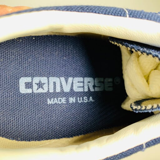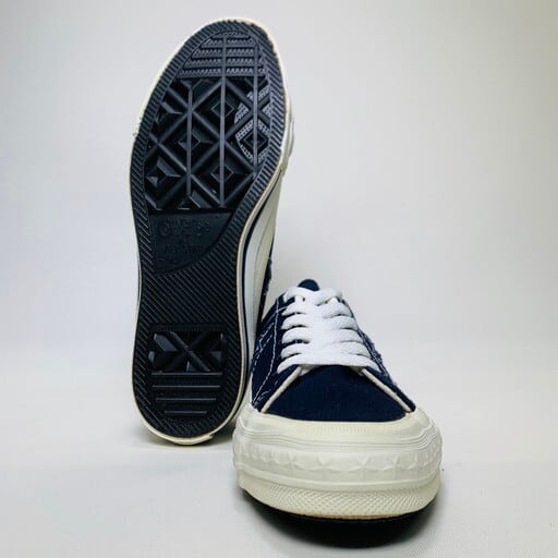90年代頃のコンバースONE STAR LOWキャンバススニーカーです。箱付き未使用のデッドストックです。ワンスターといえばレザーやスエードモデルが有名ですが、こちらはキャンバスタイプです。経年変化が一番楽しめるネイビーです。シューレースは通常のコンバースに比べ太めでボリュームのある平紐が使用されています。サイズはUS3ハーフ(レディースでは5ハーフ)で、22.5cm相当です。かなり小さめですが、ワンスターのUSA製は価格もかなり高騰していますので、サイズの合う方にはお勧めです。コレクションやディスプレイなどにも良いかもしれません。大変希少です。