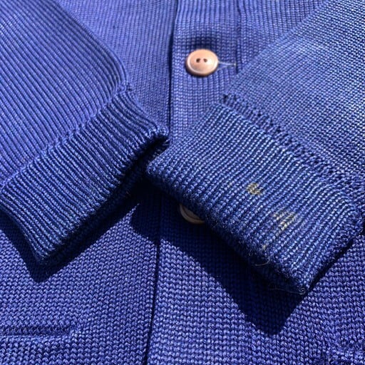 50年代頃のWil Witeアワードカーディガンです。レタードワッペンの付かないプレーンタイプです。左袖には2本のラインが入ります。濃く発色の良いブルーで、目の詰まったローゲージニットです。首元にやや変色、袖にテカリ、背面に小さなハンドリペアがございますが、比較的綺麗なグッドコンディションです。シンプルなデザインですので、コーディネートの幅も広く使えます。オーバーオールの上からさらっと羽織るスタイルもお勧めです。