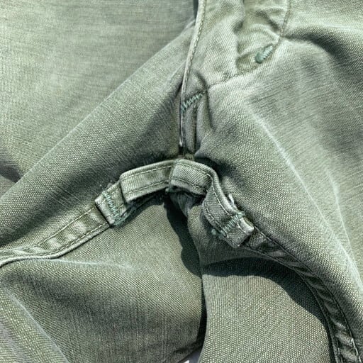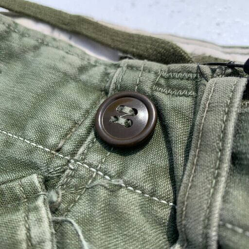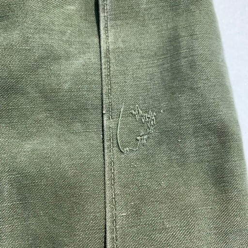 50年代初頭のM-51フィールドパンツです。ミルスペックはかすれてはっきりと確認できません。少し珍しいブラスのPRENTICEジッパーです。ボタンの欠損も無く全てオリジナルで揃っています。サイドポケット内側の止血ベルトも残っています。股には止血ベルトを通すループもございます。本来オーバーパンツですので、内側にライナーパンツを取り付ける事が出来る仕様です。一部ステッチがほつけた箇所はございますが、全体に使用感が有りやや色褪せています。サイズはREGULAR SMALLですので、程よくゆったりとしたシルエットが綺麗です。サイドアジャスターでウエストは10cm程締めれますので、女性の方でも穿きやすいサイズと思います。お探しだった方、是非いかがでしょうか。