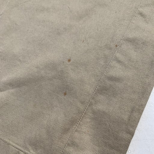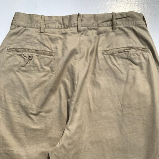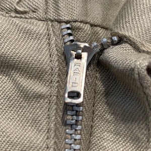 50年代ころのU.S.AIR FORCEチノトラウザーズです。SOUTHERN SPORTSWEAR社。ミルスペックは印字が消えかけている為不明。U.S.ARMYに比べ弾数の少ない希少なU.S.AIR FORCE仕様で、フロントはRAPIDのアルミピンロックジッパー。TROPICALとあるように、気温の高い地での使用目的の為、生地は通常のチノトラウザーズに比べ薄手となっており、これからの季節に最適な1本です。W34と印字されていますが、実寸はW32~33です。使用感はございますが、上t来は良好です。ゆったりとしたシルエットですので、穿きやすくミリタリーチノはオールマイティー使えるアイテムですので、お持ちでない方はこの機会に是非いかがでしょうか。