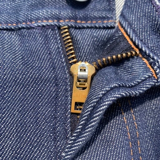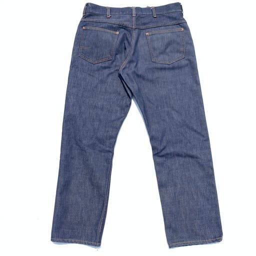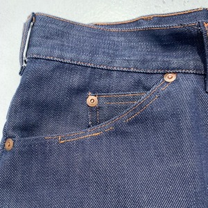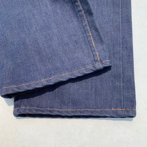 70年代から80年代頃のPENNY'S RANCHCRAFT5ポケットデニムパンツです。アメリカを代表する3大ストアのJCPennyのプライベートブランドです。VAT DYEデニムを使用しており通常のデニムに比べくすんだような色見が特徴です。フロントはTALONのセミオートマチックジッパーを使用しており、トップボタン裏はYの刻印が施されています。色落ちはほどんどなくミントコンディションといえますが、ステッチ飛びがいくつか見られます。アウトシームは脇割りですが、ロック処理されていないタイプです。ウエストW34と良いサイズ感です。インディゴデニム比べライトオンスでこれからの季節にお勧めな1本です。