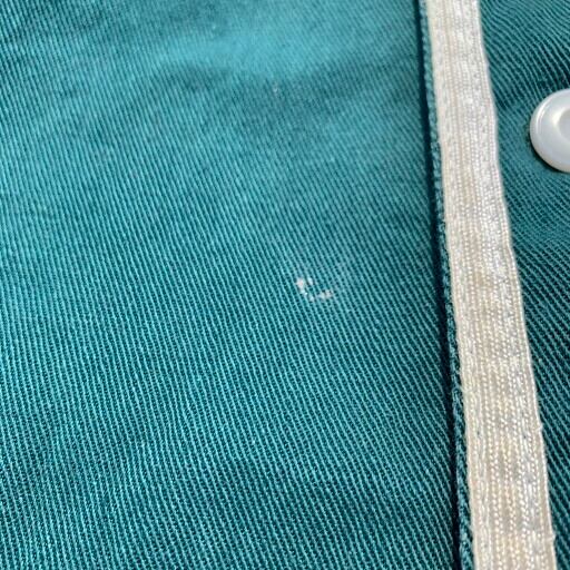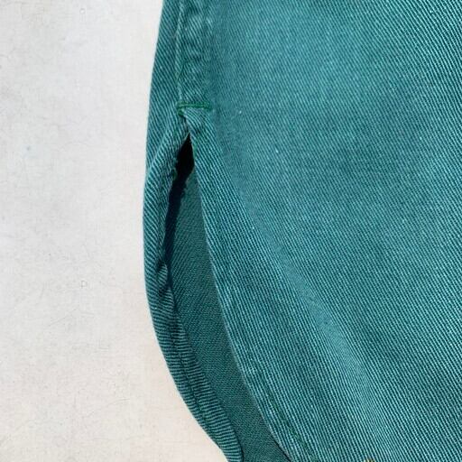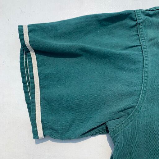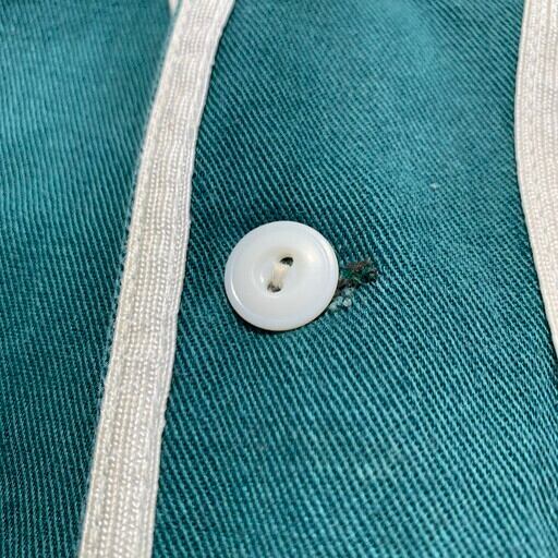 50年代から60年代頃のものと思われるUNISPORTコットンベースボールシャツです。UNIVERSAL SPORTS CORPORATIONというスポーツ品メーカーですが詳細は不明です。ウールでは無くコットンツイルのような生地感でさらっと着やすいタイプです。ベースボールシャツの中でもカラー物は比較的出現率も低く、この深いフォレストグリーンも珍しいかと思います。全体に使用感が有り、首タグも大半が欠損しています。背中のナンバーとその付近にもシミなどございます。ゆったり目で裾も長くなく着易いサイズ感です。パーカーの上に着たりサーマルなどと合わせてもかっこいいと思います。ベースボールシャツがお好きな方は是非いかがでしょうか。