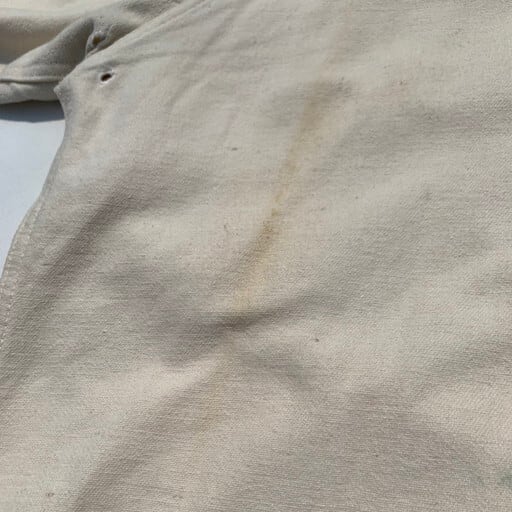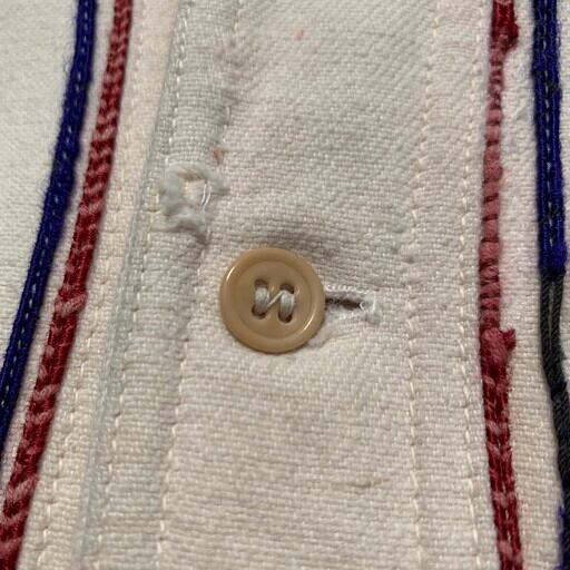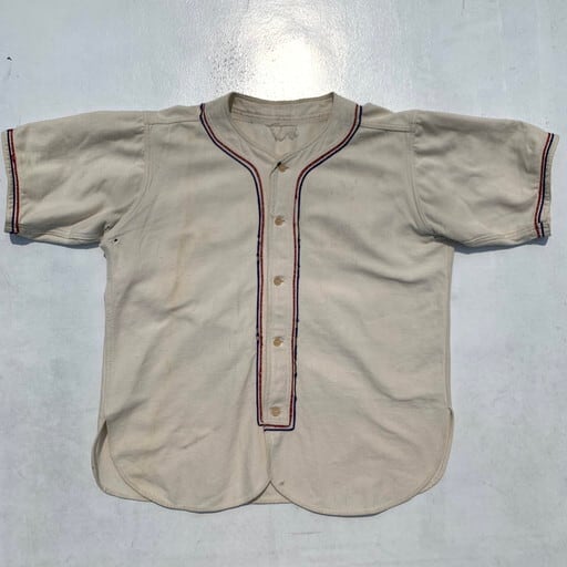 40年代から50年代頃のものと思われるウールベースボールシャツです。タグは印字が消えていますので、メーカーは不明です。ナンバリングなど無いプレーンなタイプで、サイドには待ちはございません。生成りのボディに青と赤のラインが入りトリコロールからーが爽やかな1着です。全体に使用感が感じられ、薄汚れなど見られます。2色のラインテープも所々ダメージがございます。年代を考慮すると比較的状態は良好かと思います。裾も長いタイプではありませんので、着易いサイズ感です。恐らくLサイズ位。単品や重ね着で使えるアイテムですのでお勧めです。