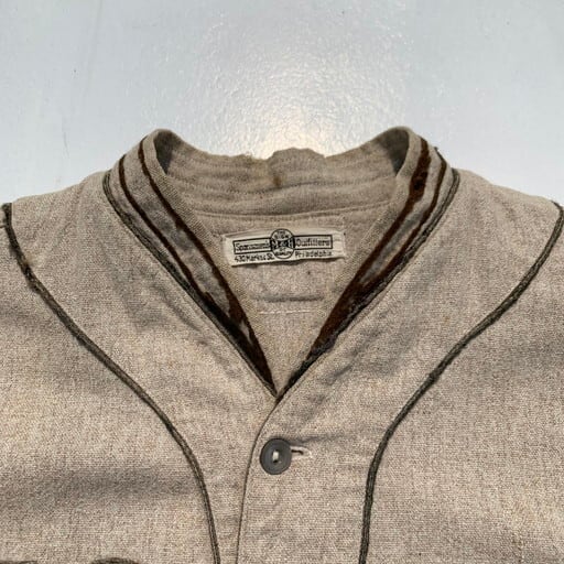 1920年代から1930年代頃の物と思われるM&H SPORTSMEN'S OUTFITTERSウールベースボールシャツです。立ち襟、シェルボタン、サイドマチ付きなど古いディティールを兼ね備えております。フロントにはクラシックなフォントで、L&Mのフェルトパッチが有ります。L&Mというベースボールプレーヤーの育成組織のような団体が現在存在しますが、この団体とは違うと思われ、当時の野球選手などが嗜好品として愛用していた噛みタバコを作っていたL&Mというメーカーではないかと推測しています。パイピングのラインテープや立ち襟のフェルト、胸元のフェルトにダメージが見られ、フロント右腹あたりにリペアが見られます。マチの一部を切り取ってボンドで貼り付けられています。シミなども見られますが、約100年程昔のアイテムと考慮すれば良好な個体です。サイズはL位で身幅がゆったりとしており着丈は長いタイプではないので着易いシルエットです。ヴィンテージを越えて、もはやアンティークに近いスペシャルですので、お好きな方は是非いかがでしょうか。
