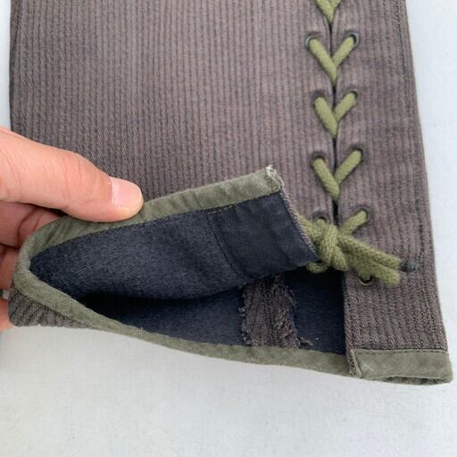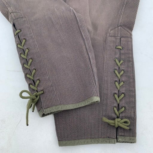 50's~60's頃のものと思われるフランス、Dumont-d'Urvilleハンティングジョッパーパンツです。フレンチピケと呼ばれる丈夫な生地を使用した1本です。膝下からのキュッとしたシルエットが特徴で、裾サイドのレースアップも上品です。珍しいカーキのパイピングと紐ですが、カスタムによるものかもしれません。股の内側は生地が2重になり補強、擦れ防止の仕様です。多少の使用感はございますが、ダメージ等も無くヴィンテージアイテムとしては非常に美品です。サイズはやや大きめで、W37くらいです。