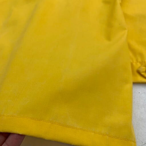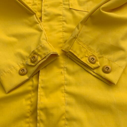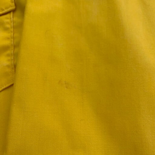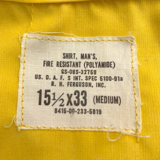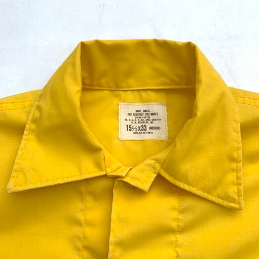 90年代から00年代頃のUSDAFSポリアミドユーティリティーシャツです。USDAFSとはアメリカ合衆国森林局を意味しており森林警備等を管轄する部署です。山火事等に備え難燃性の高い素材を採用し、森の中での視認性を考慮したような鮮やかなイエローをしています。市場に出る事が非常に稀で滅多にあまり見かけない珍品と言えます。以前に紹介したタイプと比較すると、ボタンが前立てに隠れる仕様で、袖口はボタンとなっております。MEDIUM表記ですがやや着丈が長くLサイズ相当です。薄い汚れはございますがダメージは特に見当たらず美品です。変り種がお好きな方は是非この機会にいかがでしょうか。