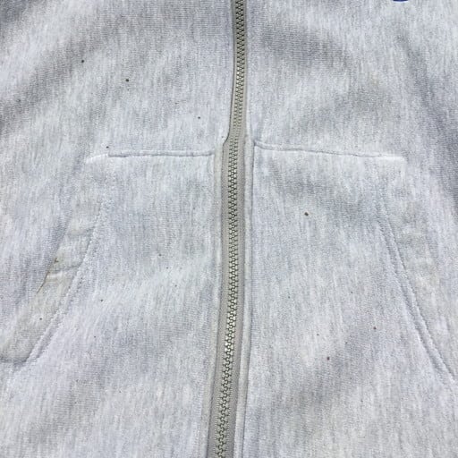 90年代頃のチャンピオンリバースウィーブフルジップスウェットパーカーです。胸元に目玉のあるシンプルな定番デザインですが、プルオーバーでは無くフルジップタイプ。玉数も非常に少なく市場でもなかなか出ないアイテムです。USA製の刺繍タグが付きます。袖やボディにシミやペンキ汚れが有り、袖口にダメージが見られます。古着らしい雰囲気がお好きな方にはお勧めです。サイズもMですので男女問わず着易いサイズ感です。近年人気急上昇で価格も高騰しておりますので、お探しの方は是非いかがでしょうか?