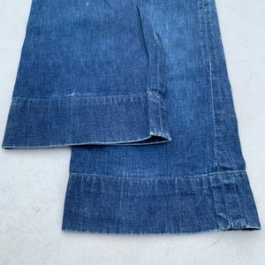 50年代頃のLee Frontier Ladyデニムランチパンツです。タグが欠損していますが、デザイン、縫製、タグ跡からLeeの物で間違いないと思われます。ペインターパンツ等に使われるややライトオンスのデニム地で、フロントではなくサイドにジッパーが付くタイプです。サイドのポケットも物が落ちにくいようにパールスナップボタンで留めることが出来るデザインです。ジッパーの引き手が紛失しています。ジッパーの下部に爪を引っ掛けるようにすると開閉出来ます。お尻部分の生地がやや薄くなっていますので、着用前に接着芯などで補強することをお勧めします。この年代のフロンティアレディーは市場にもなかなか出ない希少なアイテムです。ハイウェストでシルエットも綺麗ですので、サイズの合う方、リペアなど楽しめる方は是非いかがでしょうか。状態特価となっていますので、お早めに。※こちらはレディースヴィンテージCher取り扱いアイテムです。