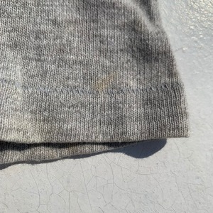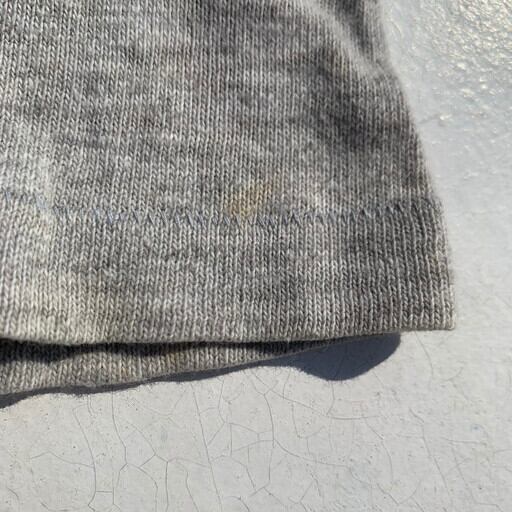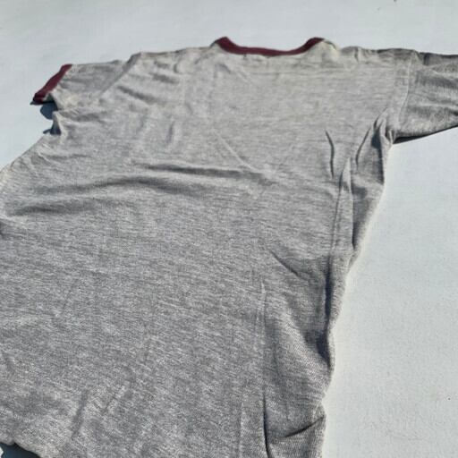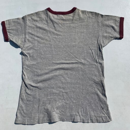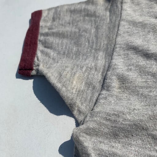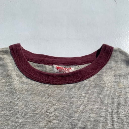 50年代か60年代頃のWILTONリンガーTシャツです。杢グレーのボディーにエンジ色の染み込みプリントが入ります。胸元に入るDOHERTY HIGHはコロラド州にある高校のものと思われます。しかし、この高校の設立は1975年ですので、業者に在庫として余っていた無地のリンガーTeeを高校が生徒用の体操着(もしくはクラブウェア)として購入し学校名をプリントしたのかもしれません。ボディはコットン100%で、少し縮みや撚れが見られます。所々うっすらと汚れていますが、小穴などのダメージはございません。Mサイズ表記ですが、S位ですので、女性も着れるサイズ感です。ヴィンテージリンガーTeeは雰囲気も良く合わせやすいので、是非1枚いかがでしょうか。