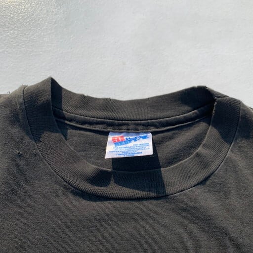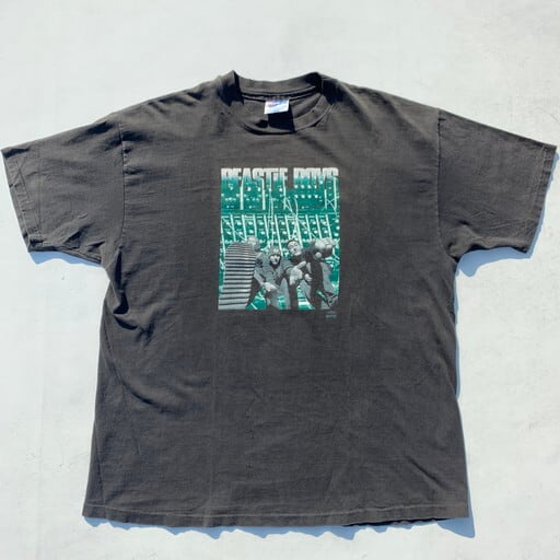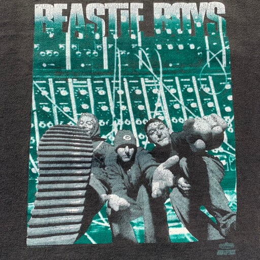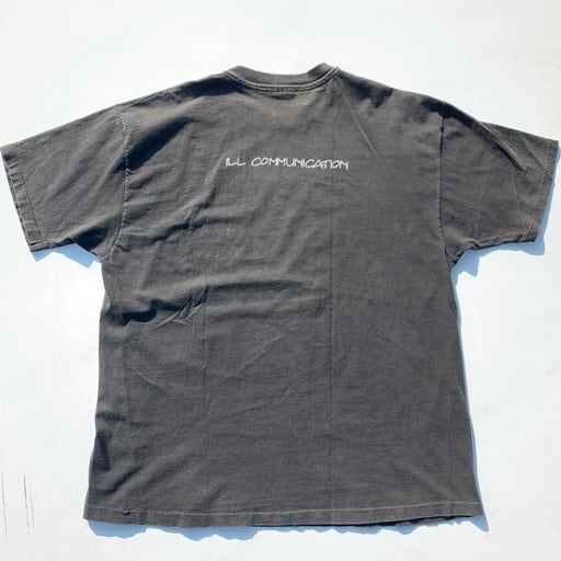 90年代のBEASTIE BOYS ILL COMMUNICATIONTシャツです。1994年に発売されたアルバム「ILL COMMUNICATION」のプロモーションTeeで、フロントはシングルカットされたGET IT TOGETHERのジャケットがプリントされています。コピーライト入りですが、やや印字が薄くなっています。プリントにひび割れ、首リブ、首元、お腹付近にピンホールなどのダメージがございます。ボディはHanes BEEFY-T、色褪せたブラックが良い雰囲気です。サイズもXLとHIP HOPがお好きな方には嬉しいサイズです。90'sなどのストリートファッションがお好きな方は是非いかがでしょうか。