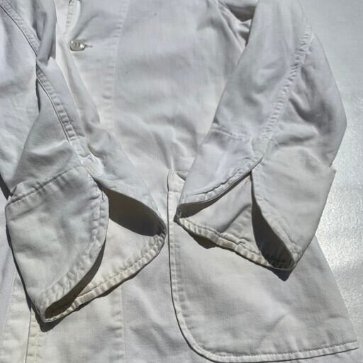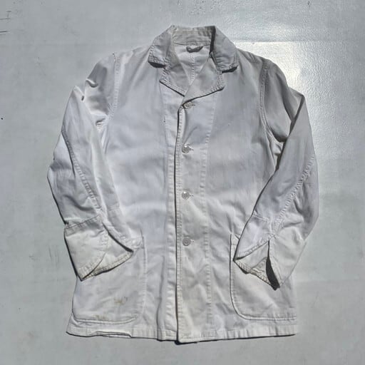 50年代のUSMCコックジャケットです。GREENBERG社製で、1957年コントラクト。MC&TSAプリントが入る事からUSMCに納入されていた物と思われます。COAT,MAN'S,WHITE,BAKERS&COOKSの表記はFOOD HANDLER表記以前に使用されていたようで、あまり市場でも見かける事が少ないかと思います。USMCのステンシルは入らず2ポケットの大戦カバーオールタイプです。袖は厚い鍋などを掴めるように作られており独特なカッティングが特徴です。小穴やシミ、ステッチ飛び等が見られますが状態はまずまずです。サイズ表記はございませんが、SMALL相当です。身幅が細いです。このタイプは本当に見かけませんので、サイズが合う方は是非いかがでしょうか。