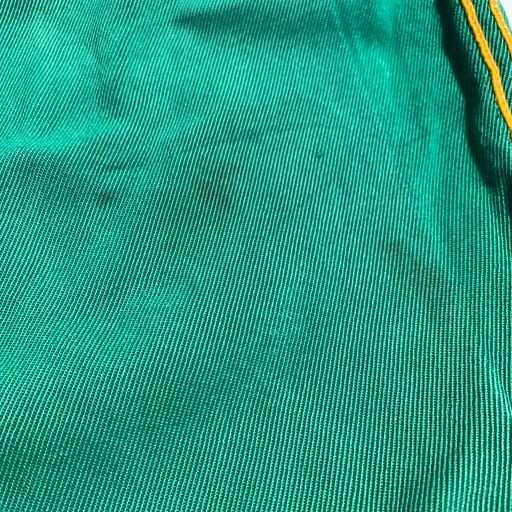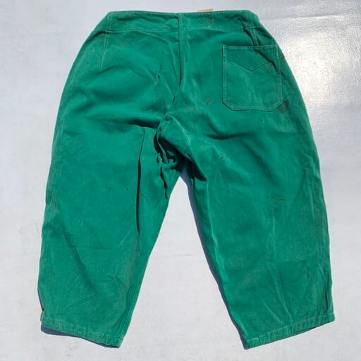 40年代頃のWilsonコットンベースボールパンツです。鮮やかなグリーンとイエローの配色が目を惹くこちらは、コットン100%の生地を使用しています。フロントはボタンフライ。上から2番目のボタンが欠損しています。ウエストタグ横に裏地の破れ、リペアがございます。所々にシミやダメージがあり、お尻付近にも1箇所たたきが見られます。ウエストはW34.ワタリもかなりゆったりしており、現在のベースボールパンツとは違いクラシカルなシルエットが特徴です。フロント両サイドに折りジワとヤケがございます。7分丈なので、ベースボールパンツらしくハイソックスで合わせても良し、くるぶしを見せたスタイリングにも使えます。インパクトのある配色ですので、シンプルなトップスと合わせてみてはいかがでしょうか。