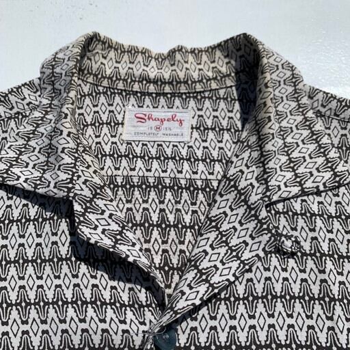 60年代頃のShaply切り替えオープンカラーシャツです。フロントポケット上部から切り替えされたデザインで、ホワイトに墨黒のようなグレーの2トーンがクラシックな印象の1着。襟は袋縫いですが、裏に襟芯が入る仕様(芯は紛失しています)ですので、60年代中期以降のアイテムと思われます。ベークライトのような古めの樹脂ボタンが使われています。柔らかい生地感ですがレーヨンでは無くコットンと思われます。襟に薄汚れはございますが、その他は比較的良好です。サイズはMのゴールデンサイズです。モノトーンの落ち着いたカラーリングですので、コーディネートの幅も広く使いやすいアイテムです。